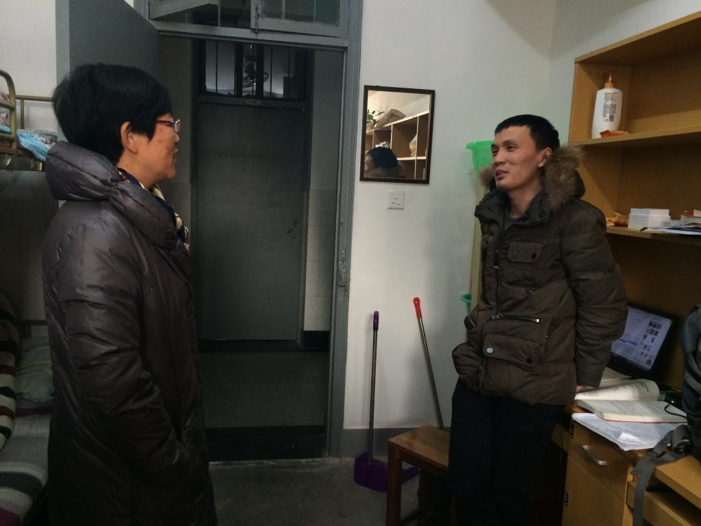 共有89位国内学生和68位留学生留宿。住宿主要分布在甬江留学生公寓、阳光留学生公寓、本部10号和15号楼四个片区。胡亚娥书记分别走访四个片区寝室,与正在寝室的学生代表进行了亲切交谈。