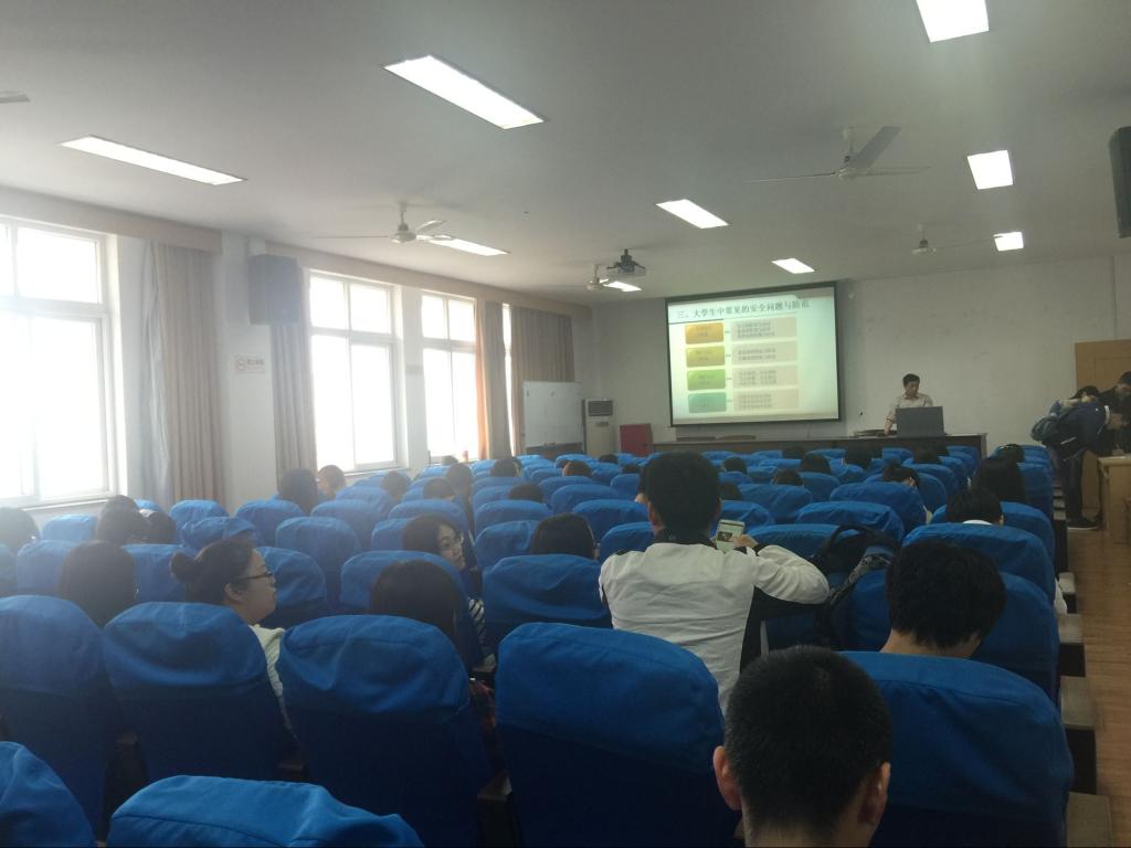 的女生寝室的火灾案例,开始给大家讲解火灾中该如何进行有效的自救,并提了一些平时同学们都掉以轻心的问题,比如一般同学习惯离开宿舍候后仍然继续使用充电器,和夜晚睡觉时点燃蚊香驱蚊等等。徐老师的话提醒不少在座的同学,提高了同学们的消防安全意识。之后徐老师又根据同学们的大学生活,介绍了如何防骗,如何识别骗术。