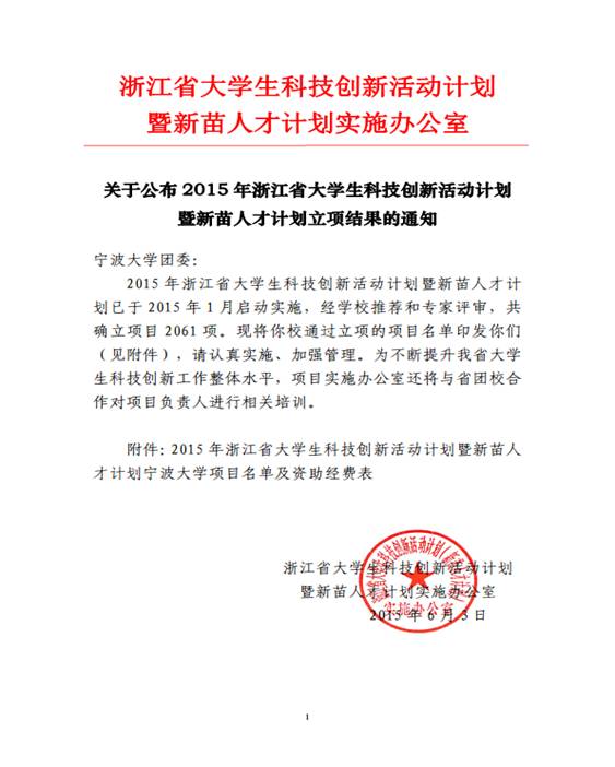 2015年浙江省大学生科技创新活动计划暨新苗人才计划