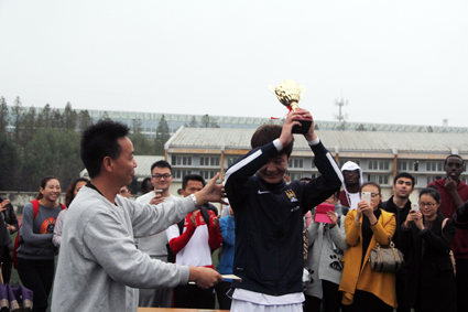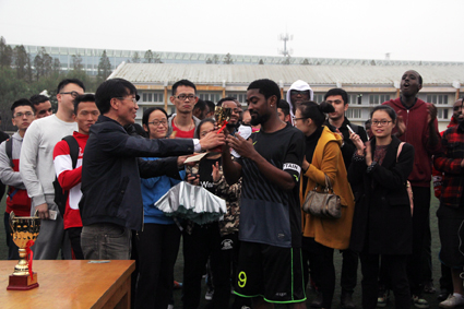共同承办的宁波大学首届中外学生足球赛暨“余姚生活网足协杯”在风雨操场顺利闭幕。宁波大学的两支校足球队和由非洲同学为主的SPIDIO队及阿拉伯足球队在两场精彩的竞技较量中决出了胜负,现场逾百名中国学生和留学生在欢乐友好的氛围中,见证了冠亚季军的诞生!