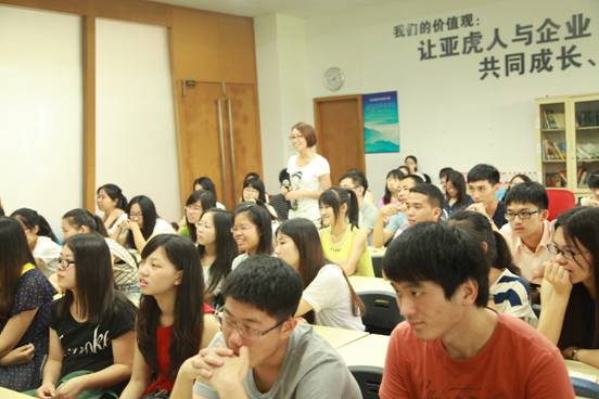 09届毕业生屠晓强、刘啸两位校友与同学们进行了面对面的交流。屠晓强校友结合自身在亚虎公司的成长历程,向同学们强调了入职初期沉下心来扎实工作的重要性。刘啸校友提醒同学们在选择工作时不要仅看到近期回报,更要注重所选工作对个人成长的帮助,希望大家能有一个明确的职业方向并为之努力。郑坚董事长就在校国贸专业同学应具备的技能和特质,公司的人才培养机制以及对外贸行业的整体环境提出了自己的见解。郑坚董事长大气随和的演讲,独特深刻的见解给大家留下了深刻的印象,也赢得了现场阵阵掌声。
