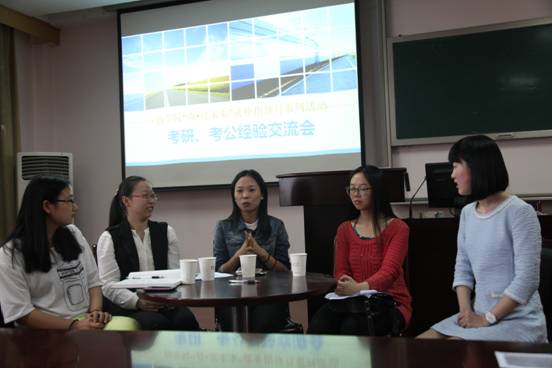 418教室顺利举行。此次分享会邀请了考取上海财经大学硕士研究生,金融系秦紫涵、保送湖南大学硕士研究生,会计系何奕轩、保送宁大硕士研究生,金融系钱欢欢、考取舟山市国税局,会计系郑珊珊4位优秀学子分享考研考公的心得体会。