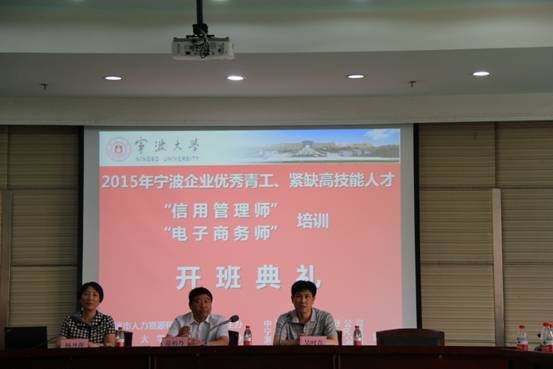 6月6日,2015年宁波市企业优秀青工“信用管理师”和紧缺高技能人才“电子商务师”两个培训项目的开班仪式在安中大楼碧华厅顺利举行。宁波市人力资源和社会保障局职业技能建设处副调研员吴时青、菠菜网站-十大菠菜网站