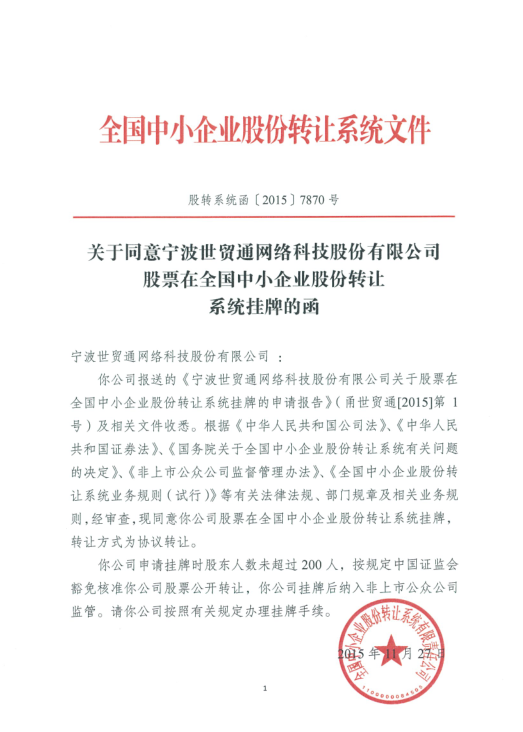 2004届国贸系校友方敏创办的宁波世贸通网络科技股份有限公司正式接到全国中小企业股份转让系统公布的 《关于同意宁波世贸通网络科技股份有限公司股票在全国中小企业股份转让系统挂牌的函》,世贸通(股票简称:世贸通,股票代码:834896)将成为全国首家在新三板上市的外贸综合服务平台领域的企业。