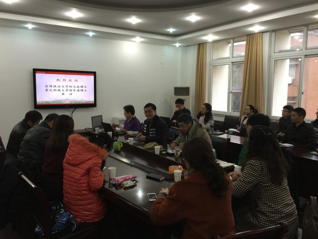 “科研下午茶”2016年第1期在11#412会议室如期举行。此次沙龙的主题:“一带一路”战略与海峡两岸经贸合作,主持人:国际经济与贸易系主任邓启明教授,主讲嘉宾:台湾政治大学柯玉枝教授、景文科技大学徐东海副教授。两位专家分别进行了题为《从ECFA、TPP与RECP看未来两岸关系发展与区域经济合作》和《台湾产业转型的契机与挑战:兼谈海峡两岸经贸合作的研究方法与体会》的精彩报告,并与在场师生进行自由交流与热烈互动。