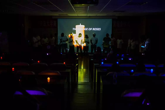 。纪念仪式在集体合照后开始。在黑暗的教室中,每位参与者一盏盏点亮了手中颜色各异的电子蜡烛,随着蜡烛的点亮,教室内的氛围立刻开始变得宁静而肃穆。这些蜡烛寄托着纪念者对亡者的追思,更代表着对未来的希望。接着,22名留学生代表上台用英语、法语和卢旺达语宣读了22条希望留言,表达卢旺达人民对振兴祖国和建立安全繁荣的未来的决心。随后,美妙的音乐声响起,5名卢旺达同学上台以极富感染力的演绎展示了一出舞台剧,描述了战后饱受摧残的卢旺达民众心灵上所受到的痛苦和伤害,表现了伟大民众的坚强与包容,让在场的观众无不为之动容。最后,卢旺达学生现场诵读了在屠杀中遇难的100个受害人的名字。这每个名字的背后都代表着一个曾经鲜活的面孔,和一个家庭。每一个名字都警醒着世人这段血淋淋的历史。