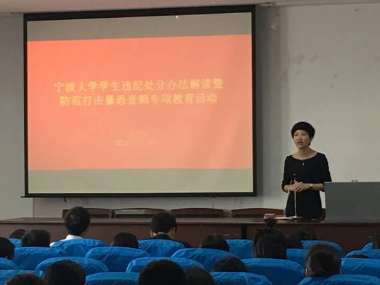 活动上,董璐老师首先为学生代表解读了《宁波大学学生违纪处分办法》和《防范打击涉恐违法犯罪行为法律法规摘要汇编》。之后,就暴恐音频事件,董璐老师提醒同学们要加强日常防范,关注网络安全,避免受到不法分子的侵害。