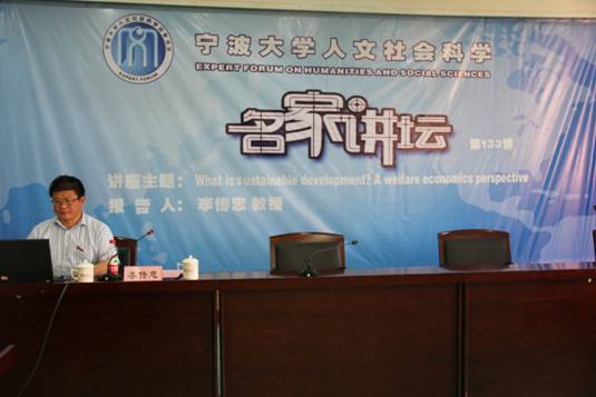 报告开始之前,李传忠教授向在场师生做了简单的自我介绍,并表达了加入宁波大学的激动之情。之后步入报告主题,李传忠教授从福利经济学的角度探讨什么是可持续发展。李教授指出当前“可持续发展”得到越来越多的关注,分析了不同学科领域对可持续发展的定义,并为在场师生介绍了1987年联合国世界环境与发展委员会报告《我们共同的未来》中对可持续发展的定义,是指“在能够满足当代人需要的同时,又不损害后代人满足他们需要的能力的发展”。随后引入福利经济学对可持续发展的定义,将一般意义上的“需要”(Need)转换为经济学中的“效用”(Utility),并介绍了萨缪尔森、Martin Weitzman(1976)、Arrow(2003)等学者以经济学的模型测度可持续发展。接着,李教授引入了“Resilience”的概念,即生态系统弹性,通过列举湖泊富营养化等例子来凸显“临界点”在生态系统弹性中的重要性。最后,李教授将福利经济学与生态系统弹性相结合来分析可持续发展,并利用澳大利亚两河流域中地下水位变化实例来阐述。主题报告结束后,李教授又向在场师生简单介绍了近期与宁波大学合作所取得的相关研究成果。