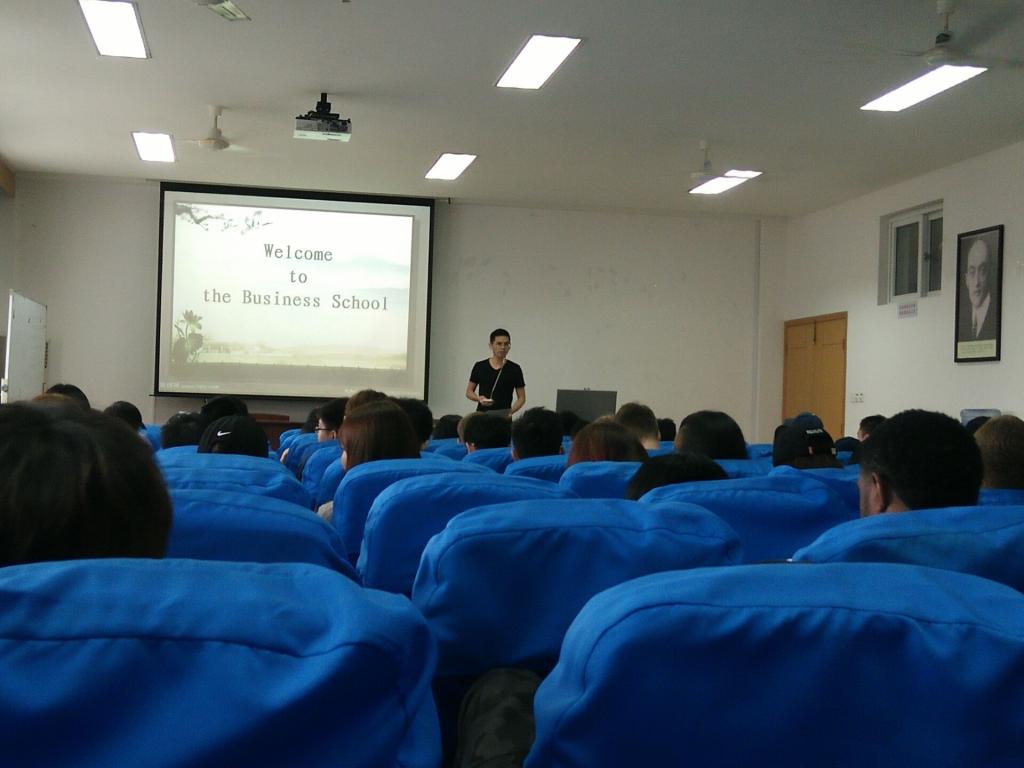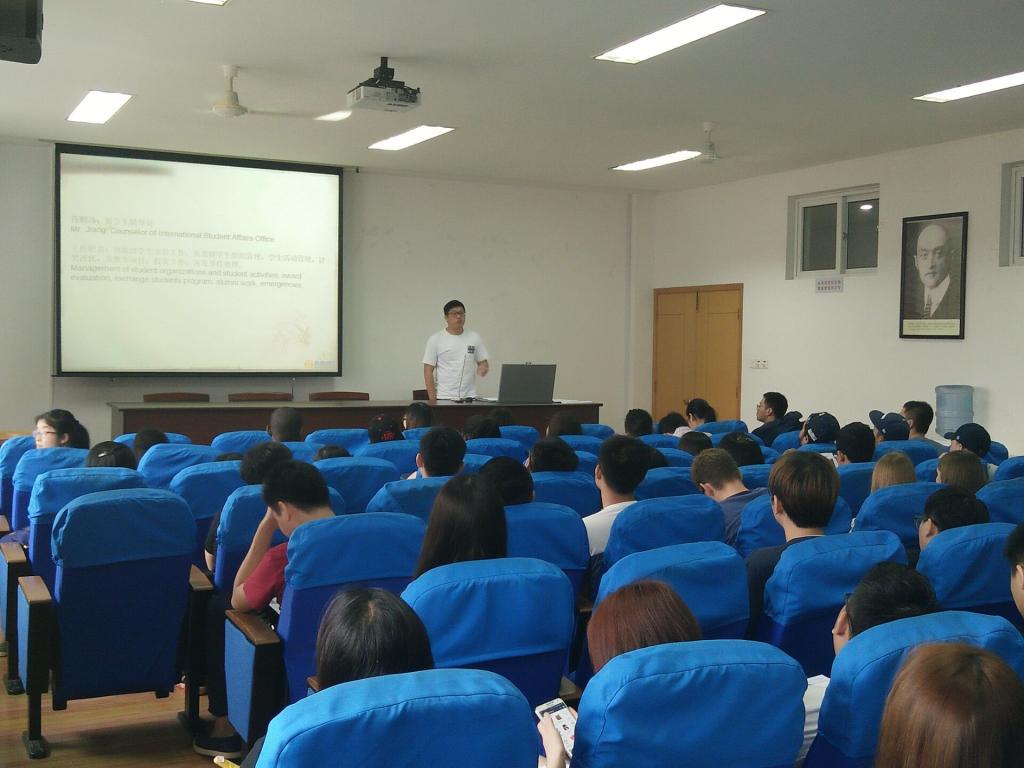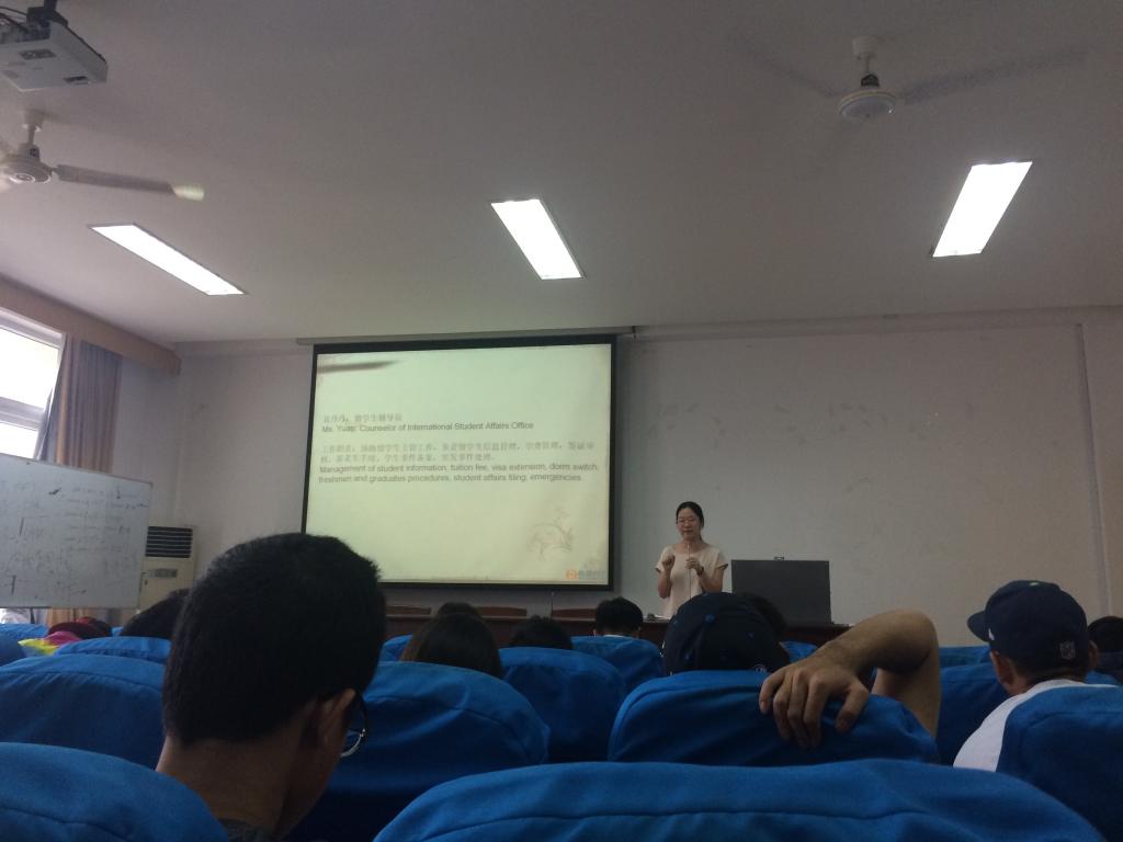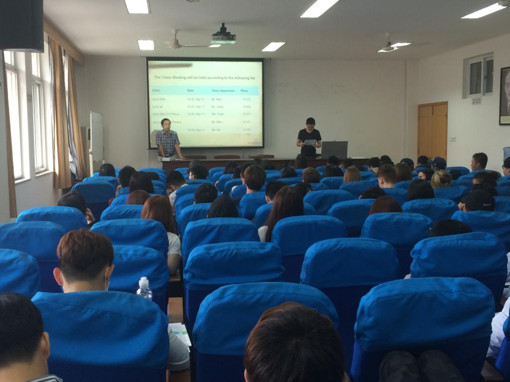 414教室。首先,毛老师向大家介绍了留学生办公室成员,并陈述了成员的职责和联系方式。接着,各班班主任进行了自我介绍并宣布了班会时间及地点。随后,王小西老师向新生们介绍了相关课程安排并且为新生们答疑解难。最后,老生代表Munawar发表了的精彩的演讲,向新生们深情并茂的讲述自己在中国的留学经验并给予新生一些学习和生活上的建议。会议结束之后,留学生组老师以及老生代表带领了新生进行了游园活动。