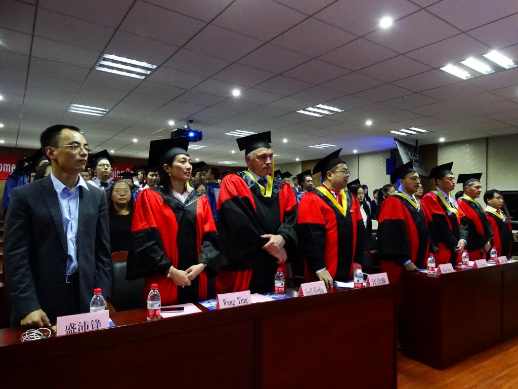 当晚八点,典礼开始。院长范柏乃教授以一句饱含热情的“Welcome!”向远道而来的澳方嘉宾和在场学员们致以诚挚的欢迎。在介绍完两校的出席嘉宾后,全体师生起立,现场奏响了中澳两国国歌。汪浩瀚教授代表宁波大学发表了讲话。他肯定了宁大中澳MBA项目创办十六年来所取得的成果——从单纯的国外学位研修项目到受国家教育部认可的学位教育项目的提升和转变。他指出我校国际化教育发展进一步加强和发挥了我校在浙江省国际合作办学领域中的地位和作用。他鼓励2016届的毕业生们“不轻言放弃”,保持梦想和激情,通过实践,实现自己的梦想和人生价值。同时,他也鼓励2016级新生珍惜学习机会,注重理论联系实际,注重本土与国际化相结合,在各自事业发展中积累成功经验,互学互助,学有所成,学以致用。紧接着,澳大利亚堪培拉大学校长Deep Saini教授发表了真挚而诚恳的讲话,他以自己在堪培拉大学的职业生涯为切入点,侃侃而谈项目创立至今为止的变化和对未来中澳双方在众多方面开展进一步合作的殷切期待。他鼓励中澳MBA的学生们通过项目的学习,积极实践自己的商业理想,并祝福这一届的毕业生能够获得事业上的成功。
