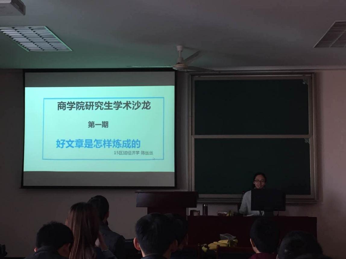 2017年第一期“商硕争鸣”学术沙龙在11#418会议室顺利举行。15级区域经济学研究生陈丝丝做了主题为“好文章是怎样炼成的?”的学术交流会。16级部分研究生参与了本次学术沙龙。