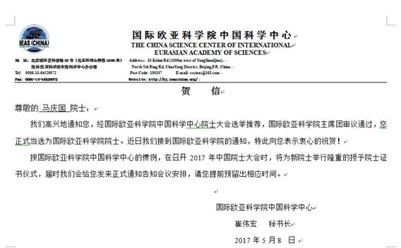 中国科学中心的贺信,我校特聘教授马庆国当选为2016年国际欧亚科菠菜网站