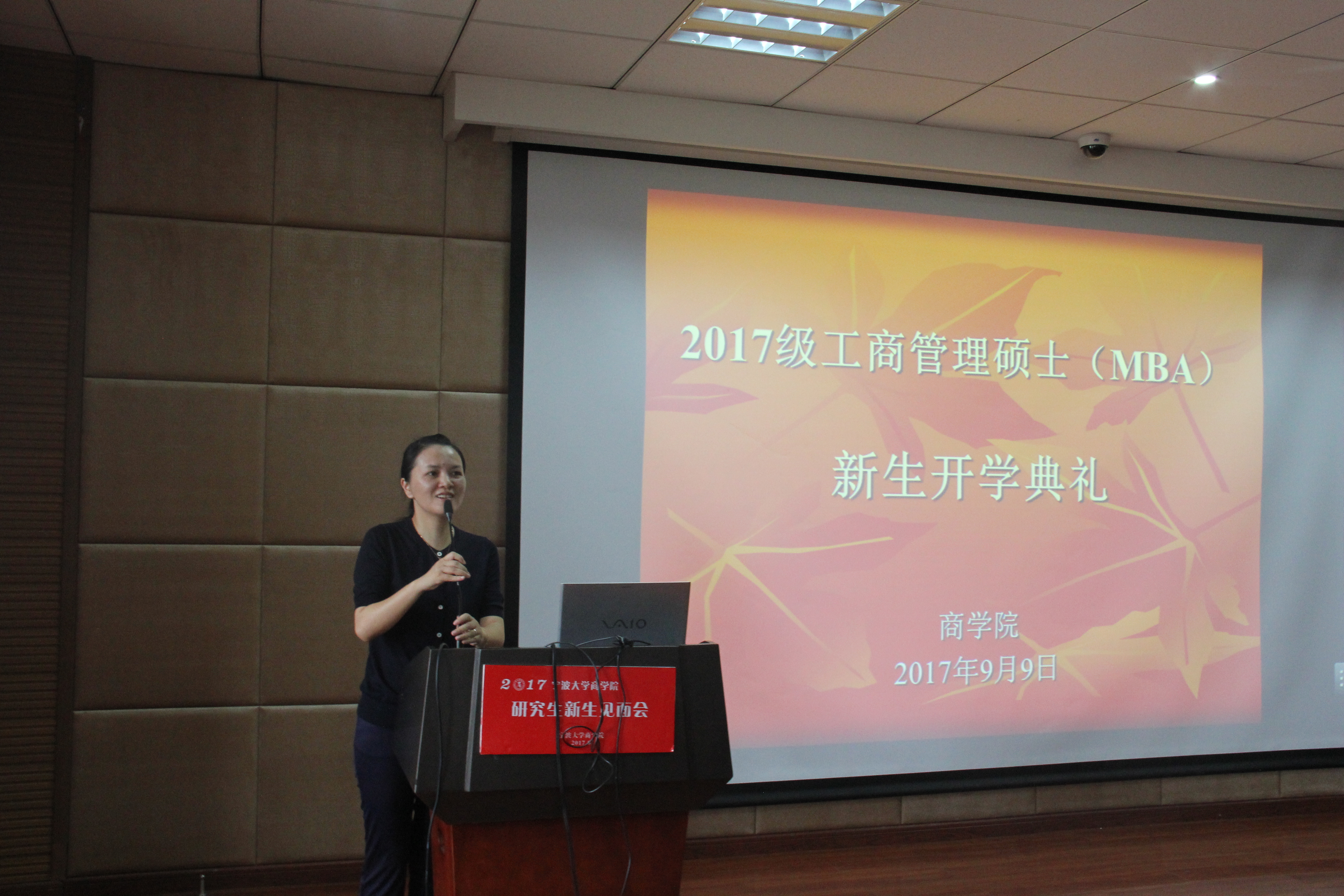 深造的MBA新同学表示衷心的祝贺和热烈的欢迎。她介绍了宁波大学MBA的教育使命及培养目标,并结合宁大MBA项目的自身定位、自身特色和经济社会的发展需求,对MBA教育明确了三点要求:一是弘扬“宁波帮”精神,培养新甬商;二是培育创业创新精神;三是满足经济社会发展需求,培养一大批优秀工商管理人才。