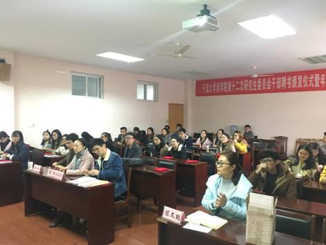 第十二届研究生委员会干部聘书颁发仪式暨年度总结大会在418会议室顺利召开。学工办主任董璐、团委书记陈彬、留学生辅导员毛跃祖、研究生辅导员陈文鹤以及全体研会成员出席了本次仪式。