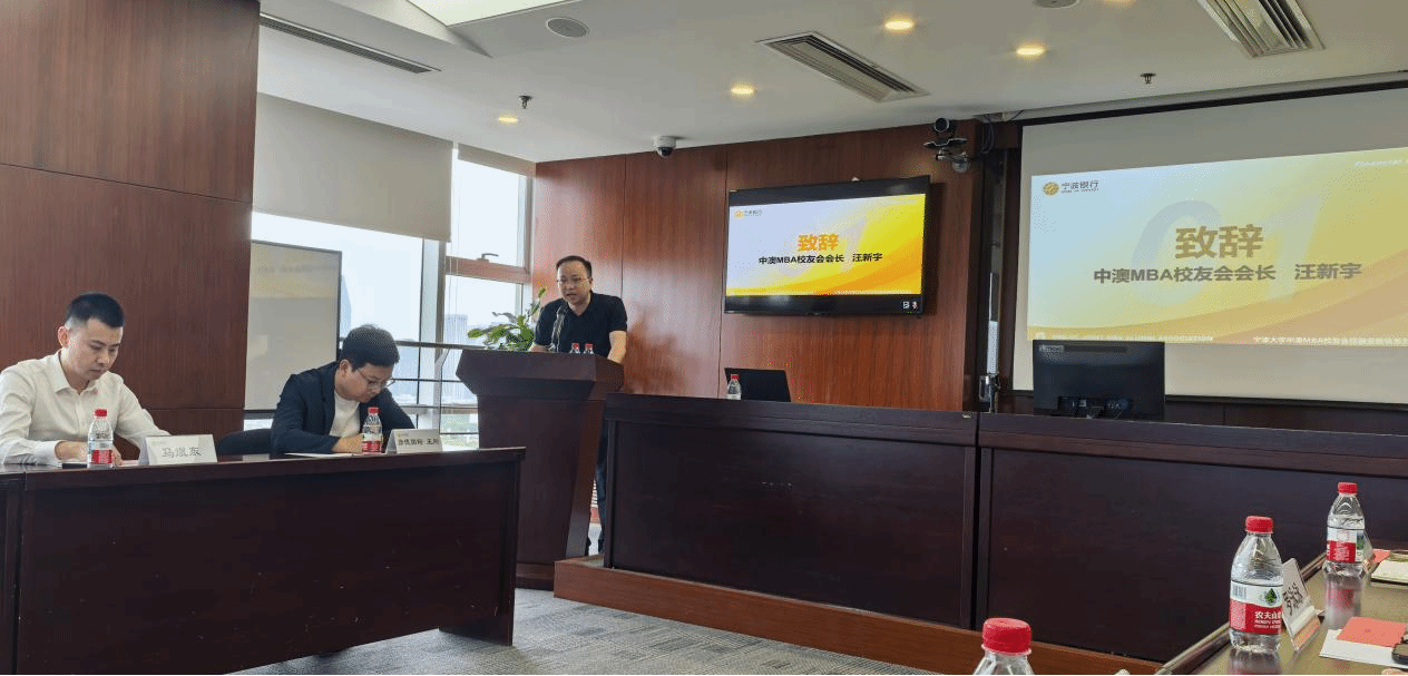 随后,宁大中澳MBA校友会会长汪新宇代表校友会致辞。他指出这次“走进宁波银行”活动是中澳MBA校友会“1+1模式投资金融板块”今年系列活动的第一站,他衷心感谢宁波银行对第十三届中澳MBA论坛活动的大力支持。他介绍校友会自成立以来始终践行"服务母校、服务校友、服务校友企业"的宗旨,现已形成七大产业板块的"1+1"特色模式。作为宁波市值最高的上市公司,宁波银行凭借差异化、国际化、数字化的创新优势成为本次活动的首选。汪会长还分享了上周参加宁波银行新加坡考察的收获,强调在当前中美贸易背景下,金融资本对企业出海、技术革新和新赛道布局的重要支撑作用。校友会期待以本次活动为起点,深化与宁波银行的战略合作,助力校友企业高质量发展。