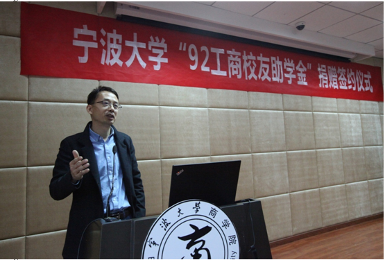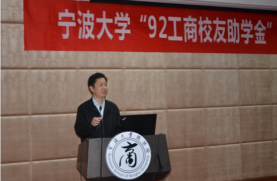 党委书记史宏协发表了讲话。史宏协书记从“宁波大学是吃百家饭长大”为切入点,追忆了92级工商本科班的感恩精神、回馈精神;同时,对受捐赠的学生和在座业余团校学生干部提出了三点希望:常念校友之情、常怀感恩之心、常立鸿鹄之志。