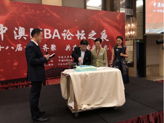 随后,嘉宾和校友们移步至隔壁大厅享用自助晚宴。校友会精心准备了庆祝中澳MBA项目十八岁成年礼的生日蛋糕。金院长和创始人邱教授一同登台分切生日蛋糕,并同全场校友们举杯祝福中澳MBA项目蒸蒸日上,越办越好。晚宴现场还为此次论坛举办做出贡献的校友和组织颁发了奖杯,进行了游戏抽奖。在众人的欢声笑语和举杯祝福声中,第九届宁波大学中澳MBA论坛圆满地画上了句点。