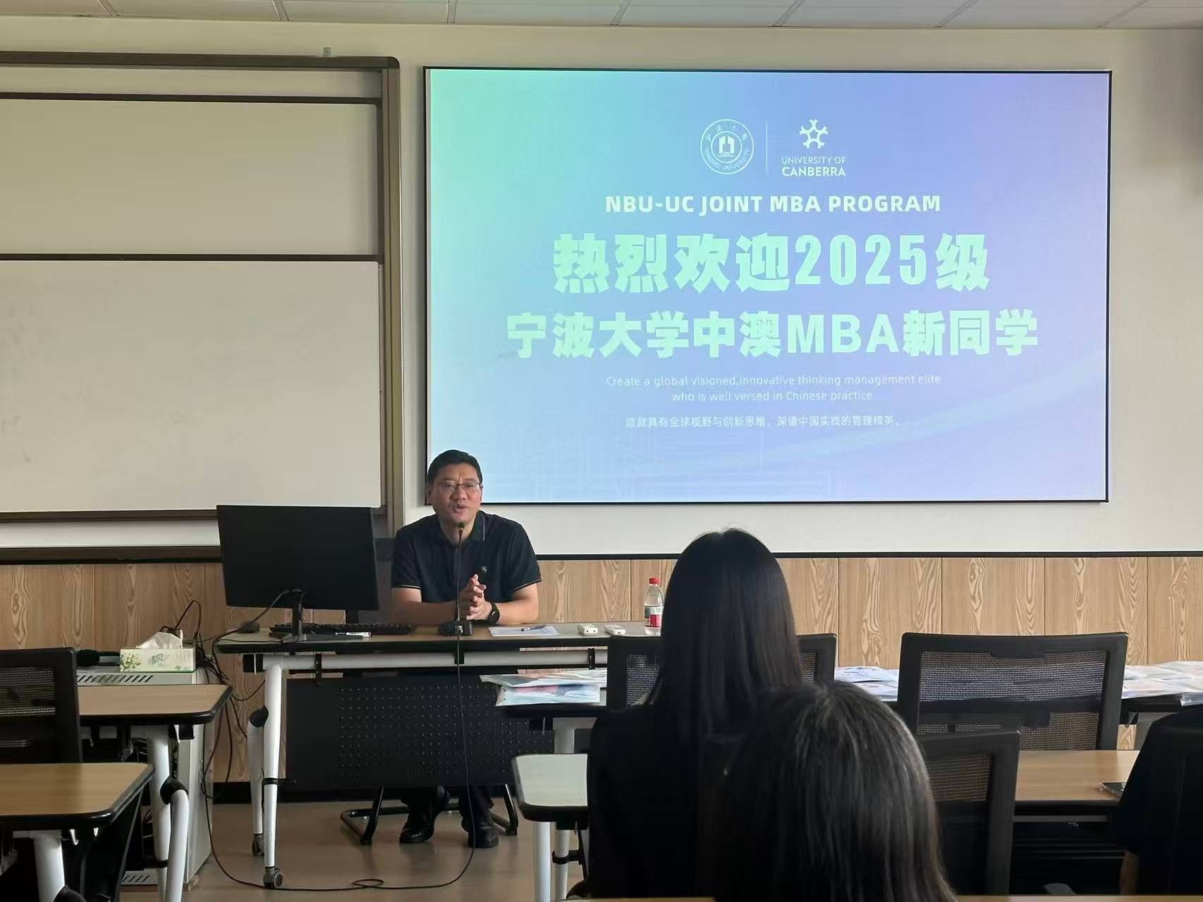 副院长彭新敏教授代表项目致辞。他指出,中澳MBA项目融合了中西方的管理学理念,经过24年的完善和发展,已为社会培养输送了1000多名工商管理精英,具有品牌保证。其次,项目通过多年累积,已汇聚了具有较高价值的校友网络,打造了高质量的人才沟通与交流平台,持续为项目和校友企业赋能。他鼓励新生积极参加校友会组织的活动,加入这一终身受益平台。最后,他从保障出勤与时间管理的角度出发,向新生提出新学期的学习要求,他指出在中澳MBA项目学习的这两年中,学员们应该明确取舍,主动“牺牲”掉一些娱乐和休闲的时间,才能更有效地保障学习。他鼓励学员们多带家人走进校园,感受安宁沉静的文化环境,可利用周末上课机会,带家人和孩子到宁大校园里参观和学习,营建浓厚的家庭学习氛围。最后,彭院长还强调了杜绝学生使用AI工具实施学术不端的行为。