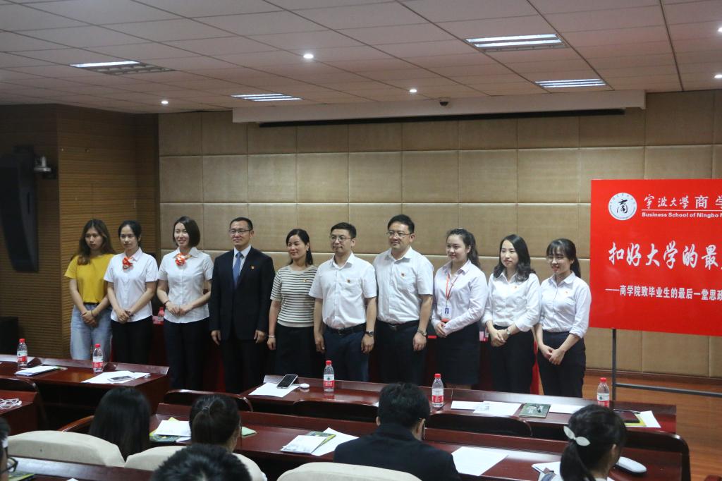 举行“扣好大学的最后一粒扣子”——致毕业生的最后一堂思政课暨毕业生廉洁教育活动。宁波银行总行营业部总经理石文、中国银行宁波市分行江北支行高级业务经理陆忠伟、中国银行宁波分行团委书记周迪、学校宣传部副部长孙欢欢老师、菠菜网站