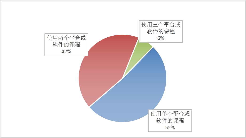 老师采用两种平台或软件混合教学的课程有159门次,占了总开课课程数的42.4%,采用三种平台或软件混合教学的课程有23门,占比为6.1%。