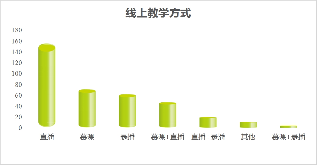 教师们采用线上教学方式有直播、录播、慕课等,其中直播占41.9%、慕课占19.2%门次、录播占16.8%门次、各种组合占19.2%,其他方式占最小只2.9%。