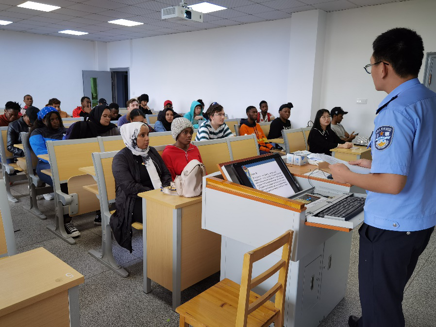 为留学生现身说法。王警官以案说法,以案示规,用大量生动丰富的治安案例教育警示学生,让学生们受益匪浅,吸引了很多留学生来现场交流。