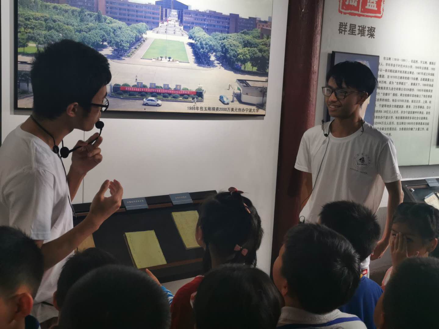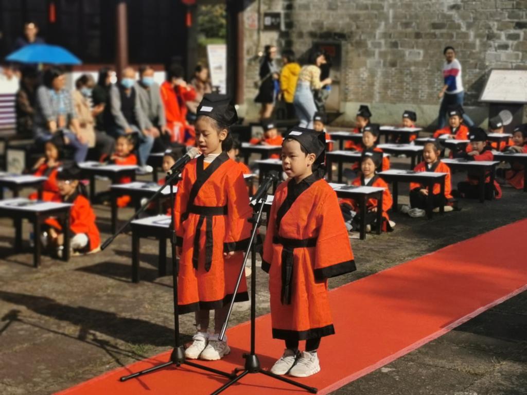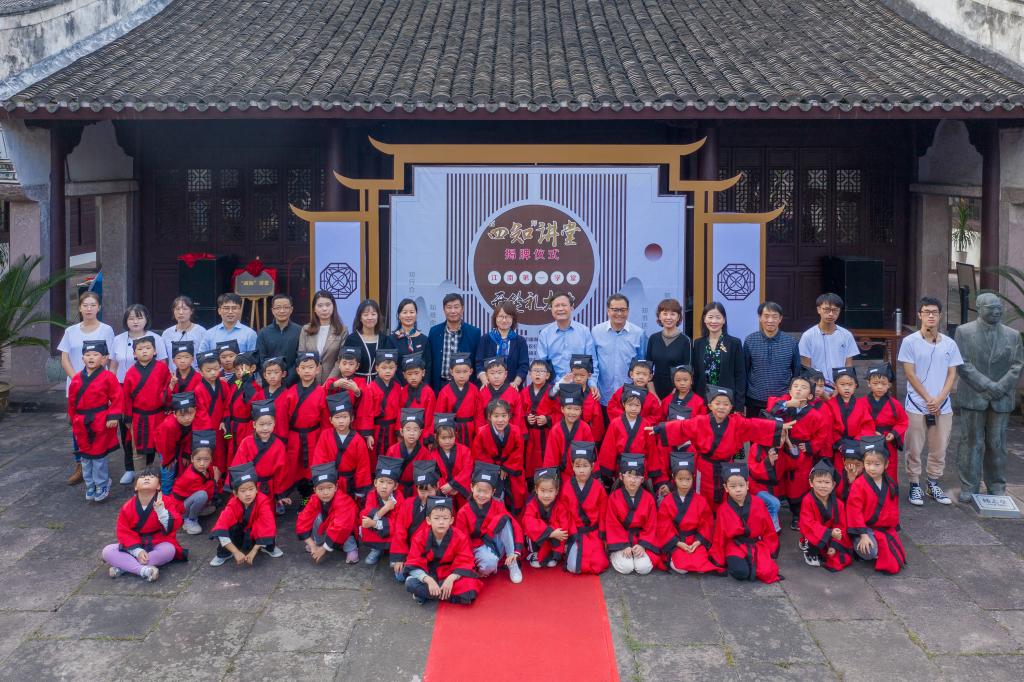 最后,文“话”商帮宣讲团成员,来自本科生第五党支部18经济学班的四名学生,为侨胞眷属代表、镇海实验小学学生等百余人讲说“四知”讲堂第一课,围绕江南第一学堂,诠释新时代宁波“四知”精神与宁波帮精神。