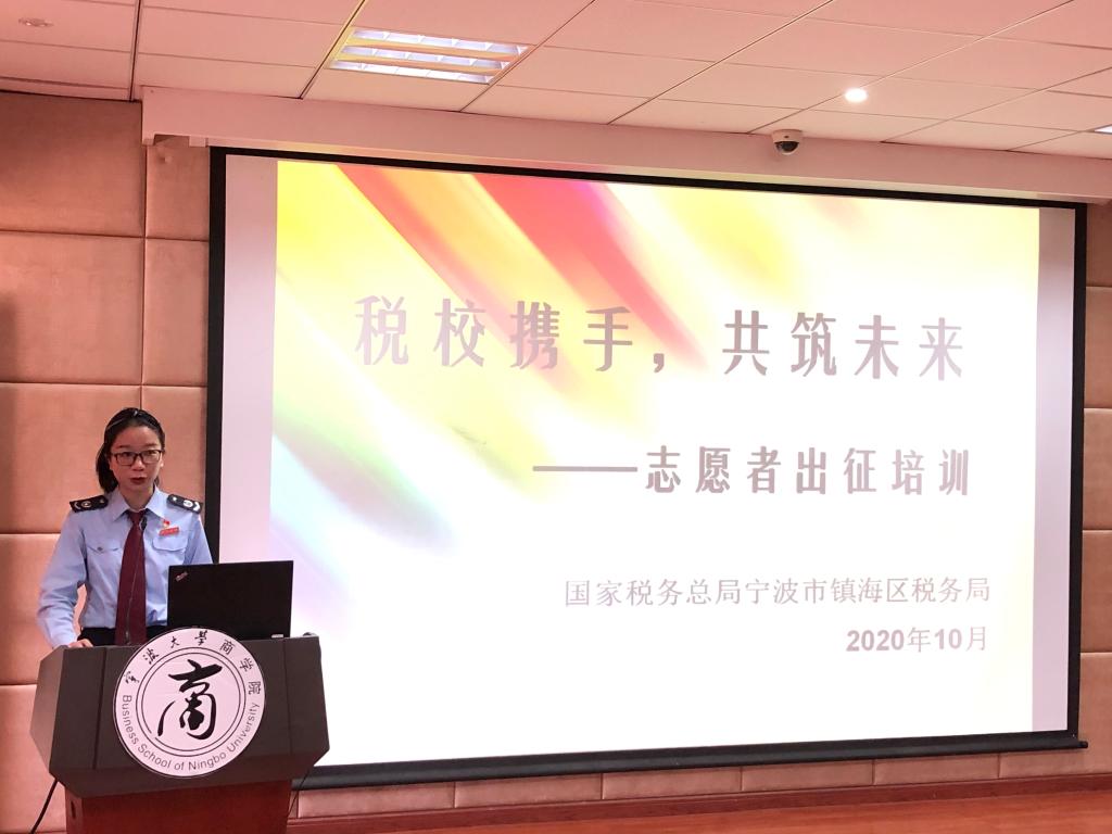 109报告厅举行。宁波市镇海区税务局副局长屠晓军、镇海区税务局纳税服务科科长方锐、镇海区税务局蛟川税务所和骆驼税务所负责老师、十大菠菜网站