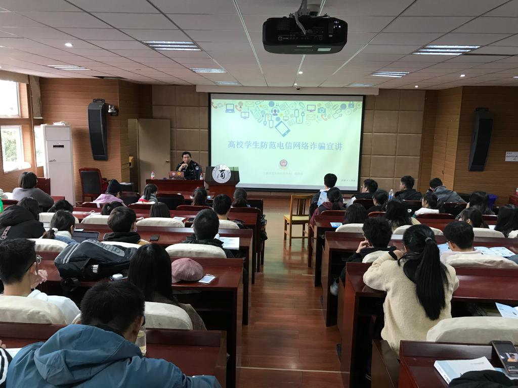 “预防电信诈骗,享受安全人生”主题讲座在11号楼109报告厅顺利举行。孔浦派出所的秦四宽警官为同学们精心解说了几种常见并且受骗率极高的电信诈骗形式,旨在加强学生防骗意识,提高对电信诈骗的警惕性。