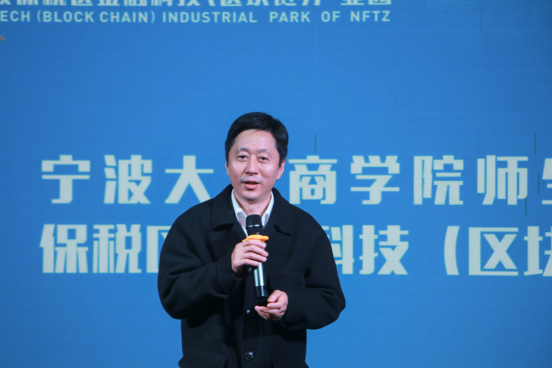 的师生们介绍了金融科技(区块链)产业园,保税区管委会自2017底开始筹建,着力聚焦金融科技和区块链技术的创新应用,携同创业邦共同打造以产业集聚、项目孵化、落地应用为一体的产业生态园,同时与宁波诺丁汉大学合作设立区块链实验室,以及与成都电子科技大学合作搭建保税区数字经济产业园等。通过两年多努力,园区发展势头呈现良好态势,为宁波地区传统产业数字化和互联网化转型提供了有力支撑,并将努力为区域数字经济发展持续贡献力量。现在保税区通过引进金融科技、区块链企业,以新型的科技技术力量赋能本地传统产业,链接本地各方资源,打造金融科技产业生态园区。