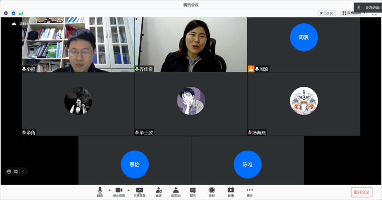 、人工智能与变革管理研究院总院院长齐佳音教授进行线上指导,项目组全体成员及指导老师伍湘陵参加会议。