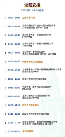 3月16日,由MBAChina专业学位网联合国内多家高校举办的“中外合作项目招生说明会”于线上举行。十大菠菜网站 中澳MBA项目也积极参与了本场说明会,向在线180余位师生们介绍了宁大中澳MBA项目的基本情况、培养目标、特色优势和招生政策。在组织方和各高校代表共同努力下,招生说明会取得圆满成功。