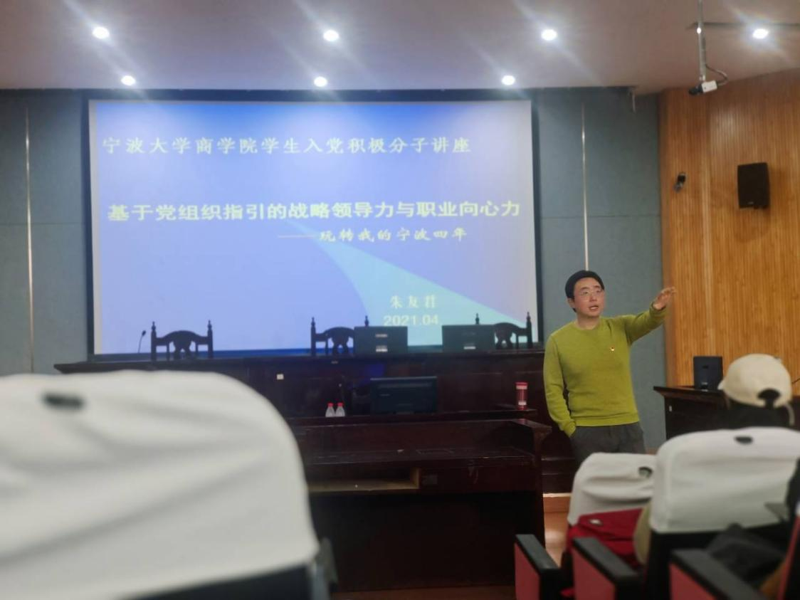 党委分党校第44期积极分子培训班第二讲在第五阶梯教室顺利举行,主讲题目为《基于党组织指引的企业领导力与职业向心力》,120余名党校积极分子学员参加。宁波市滨海研究院副院长朱友君老师担任主讲人。