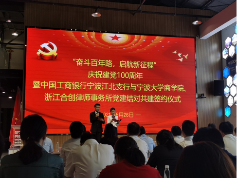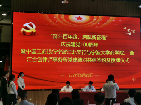 与中国工商银行宁波江北支行、浙江合创律师事务所在宁波文化创新港人才之家共同举办“奋斗百年路,启航新征程”党建共建结对活动。院党委书记史宏协、院党委副书记韩雯琛、江北区司法局局长林幼红、江北区司法局副局长欧金铨、工商银行宁波江北支行党委书记童晓松、浙江合创律师事务所党总支书记邓旭东及三方共建单位党员同志共同参加。会上,共建三方举行了党建共建签约授牌仪式,同时开展了红色主题教育活动。