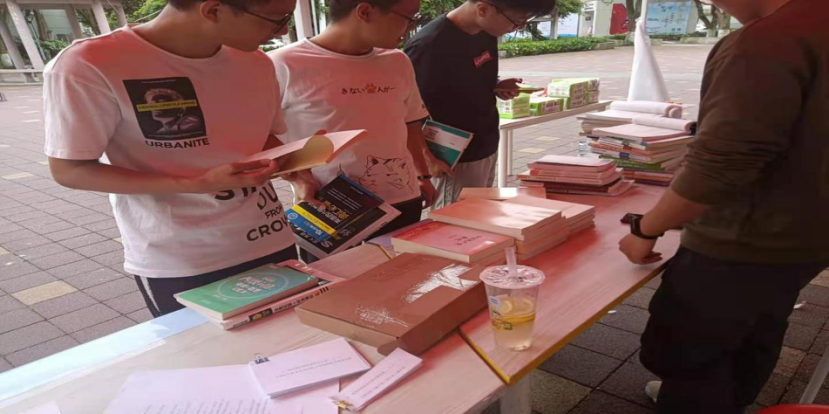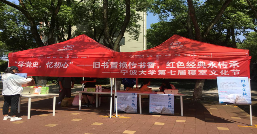 社委会在有思广场开展了"学党史,忆初心"——旧书置换传书香,红色经典永传承为主题的寝室文化节活动。