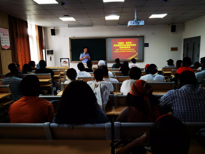 为留学生现身普及公共和校园安全知识。讲座上,王警官结合社会安全事件种类、特性和危害,用大量生动丰富的案例教育告诫留学生要学会保护自己和朋友,留学生们受益匪浅。