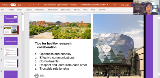 副院长周新苗教授致辞,双方希望进一步加强两校的科研合作,共同发表高水平论文。本次会议的报告主题分别为:1. 如何通过综合报告(Integrated Reporting)在高校创造和传播价值;2. 主动监管能提高并购公司的价值吗;3. 普惠金融增加家庭收入:通过何种渠道;4. 探讨员工对外部企业社会责任与内部企业社会责任感知失衡的反应。