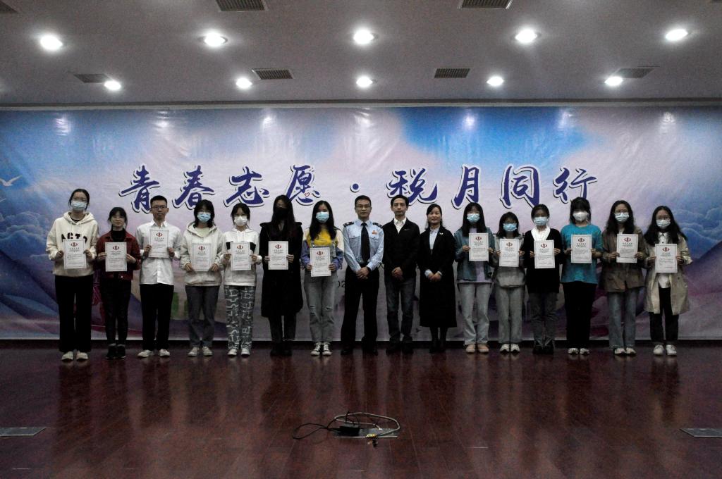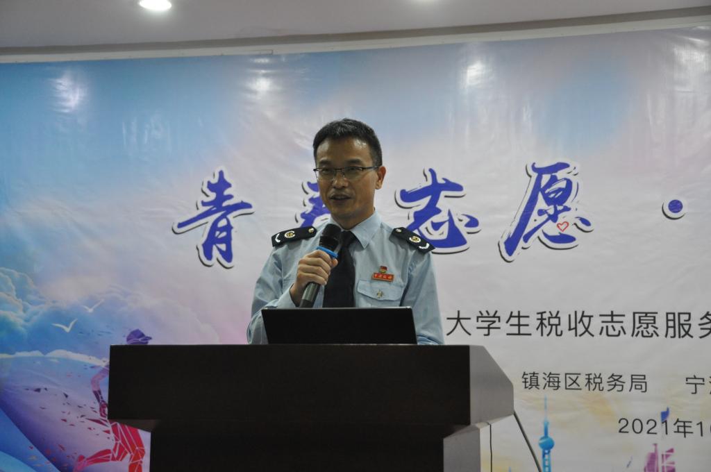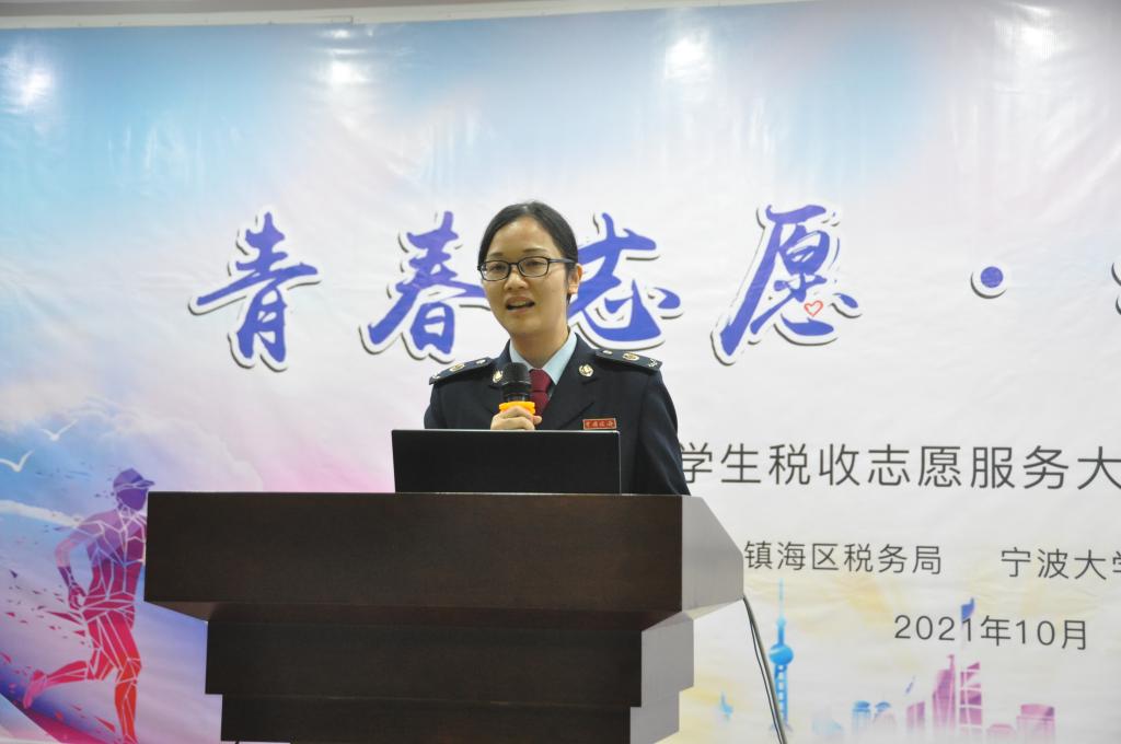 党委副书记韩雯琛、本科生第六党支部书记董璐受邀出席,镇海区税务局纳税服务科及各税务所业务骨干和“蓝精灵”大学生税收志愿服务大队第七批队员代表50余名同学参与此次活动。