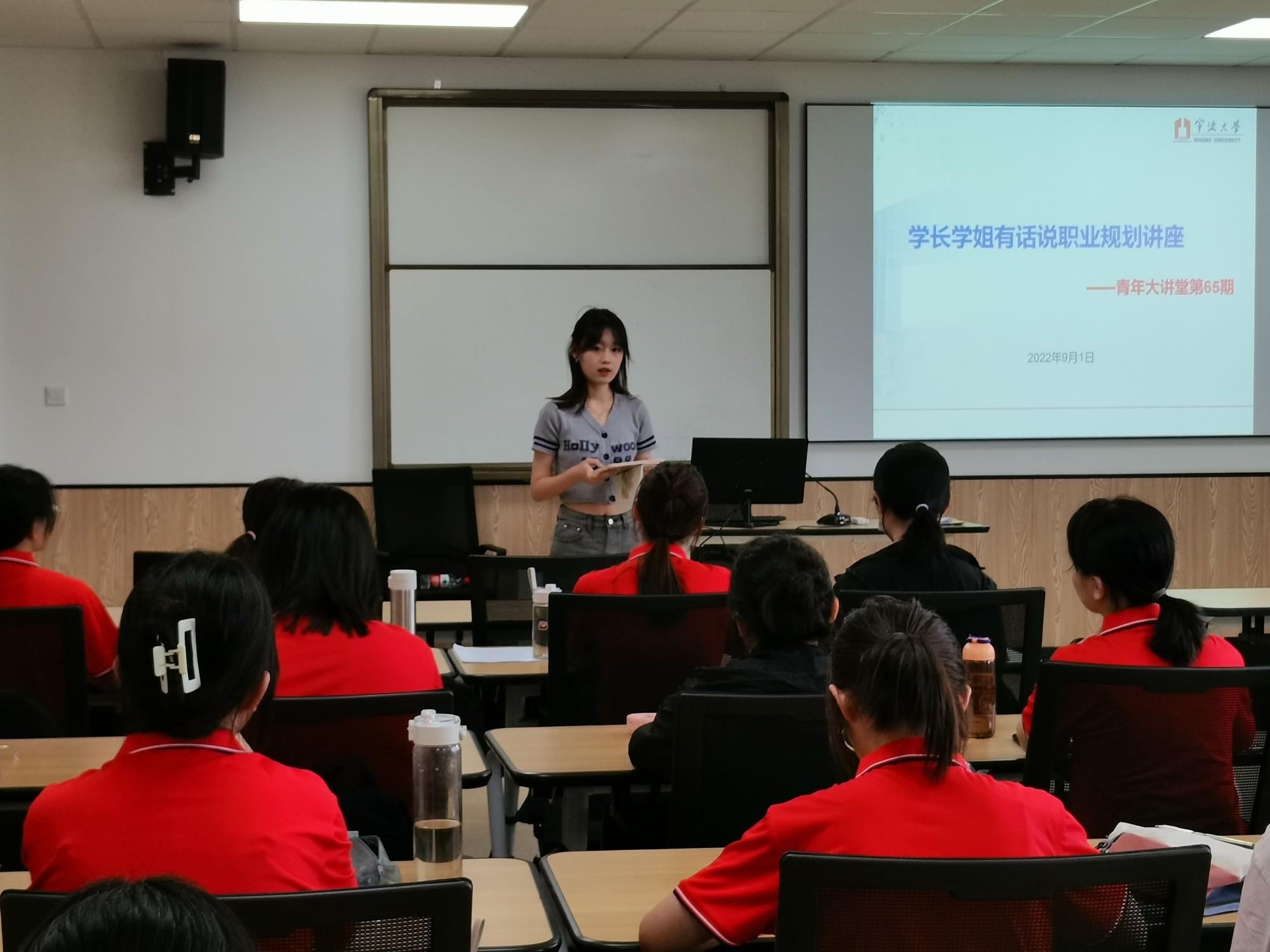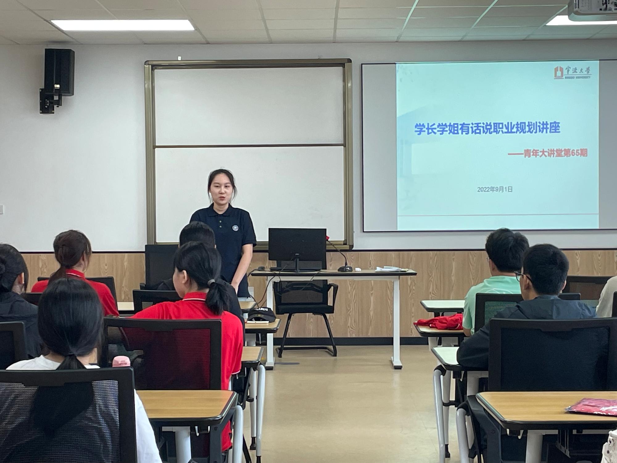 422举办了学长学姐有话说职业规划讲座,邀请研究生戴佳颖,本科生王嘉怡和谢懿担任主讲人,讲座由学工办龚昆朋主持。