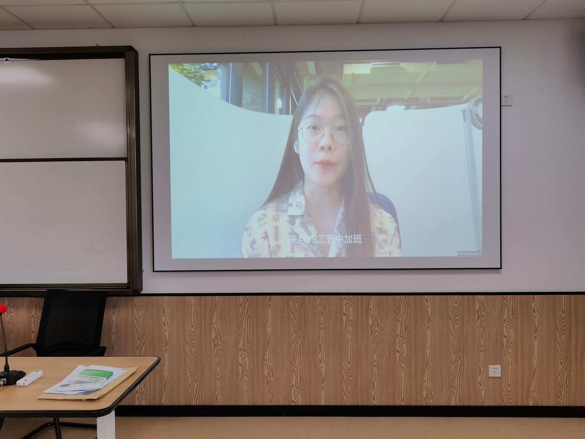 最后由19工商管理中加班谢懿以线上交流的形式发言。她首先强调了大学学习的重要性,并讲了全英文授课中的学习方法;接着她结合自己的竞赛经历介绍了互联网+等比赛,结合社团工作介绍了菠菜网站