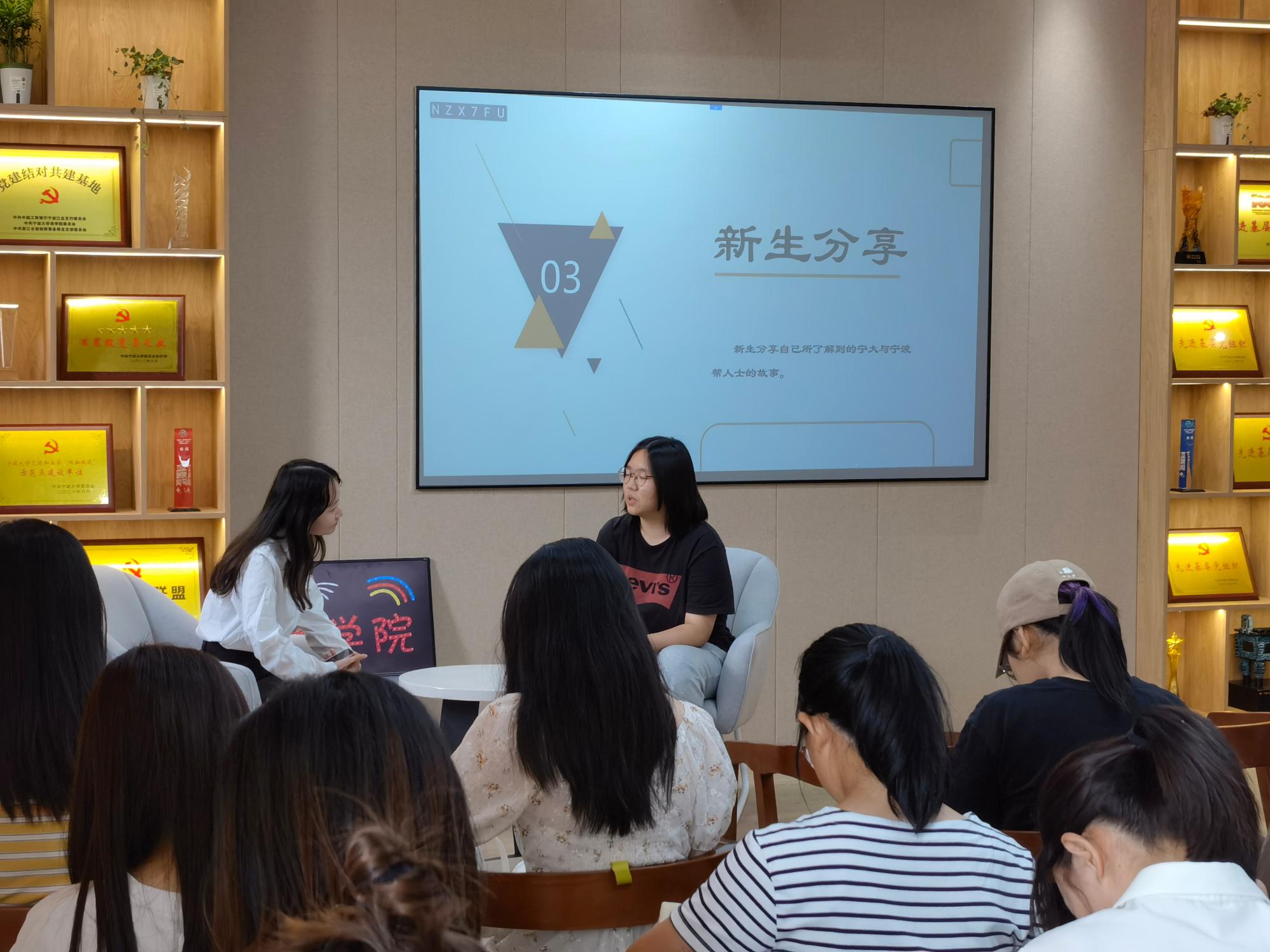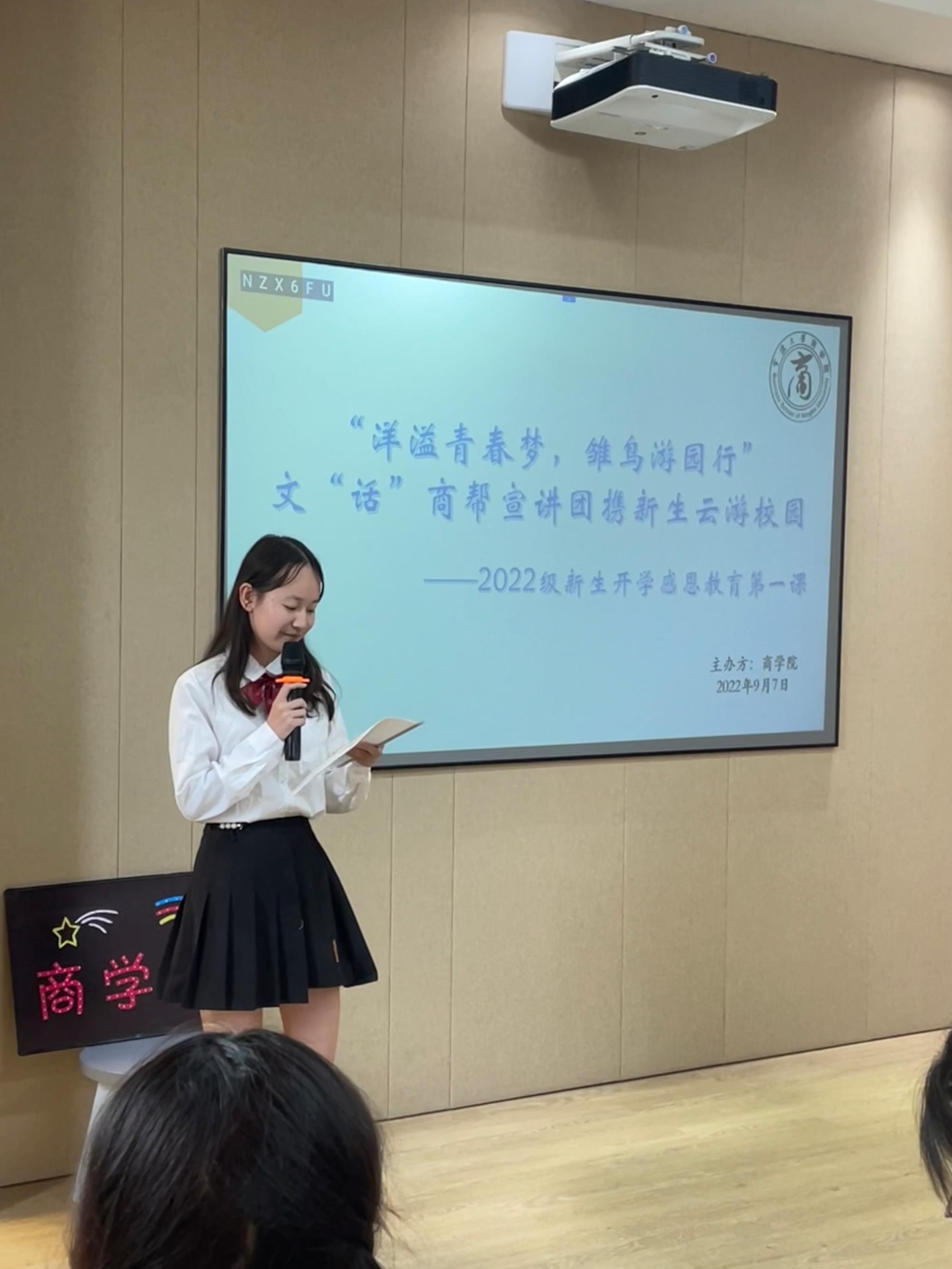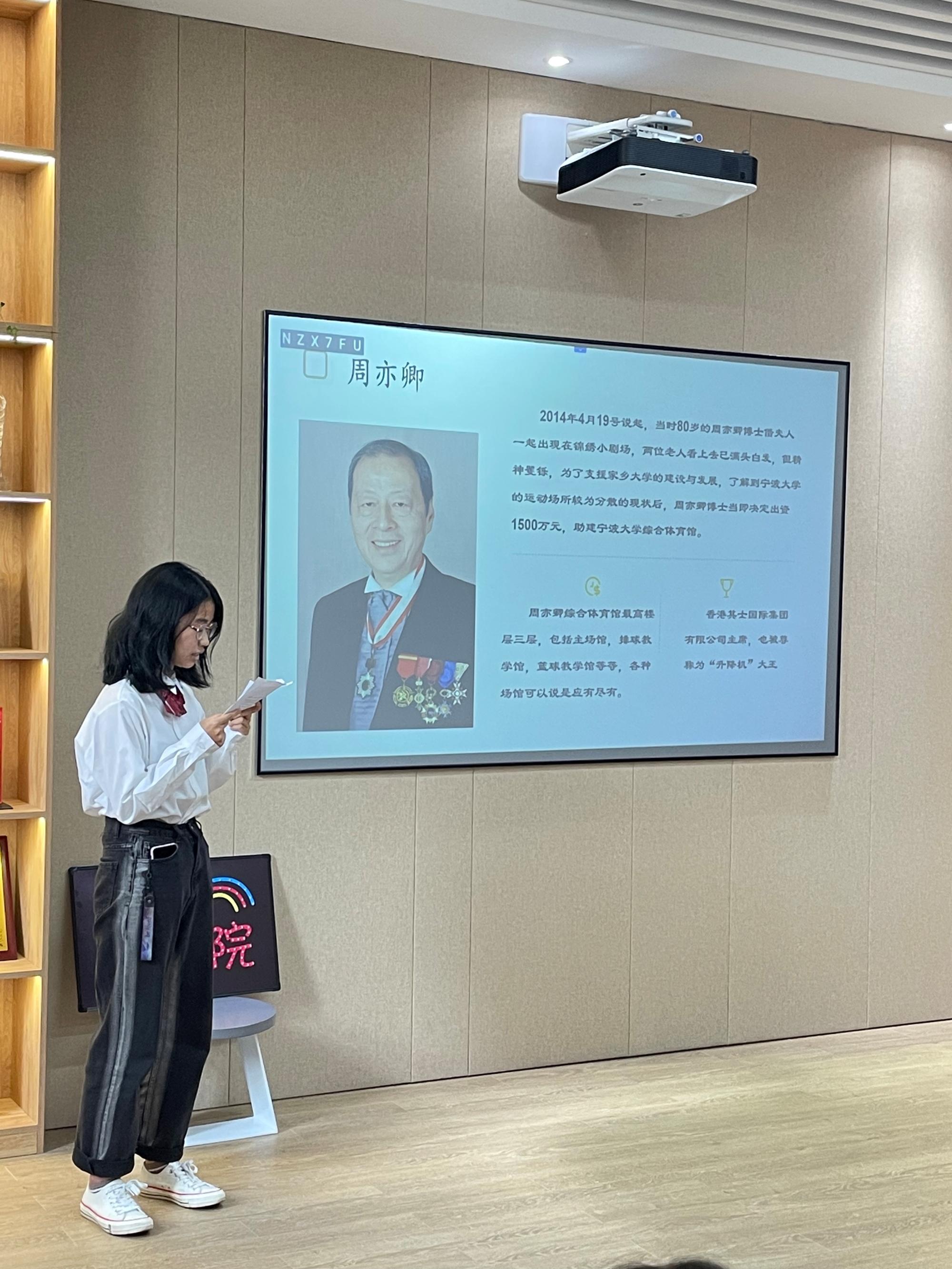 活动以文“话”商帮宣讲团成员录制的宣讲视频开场。宣讲团成员用图片与视频的形式模拟了校园情境,化身小导游,向新生一一讲述了宁大楼宇背后的故事,体会宁波帮人士与宁大的深厚情谊。