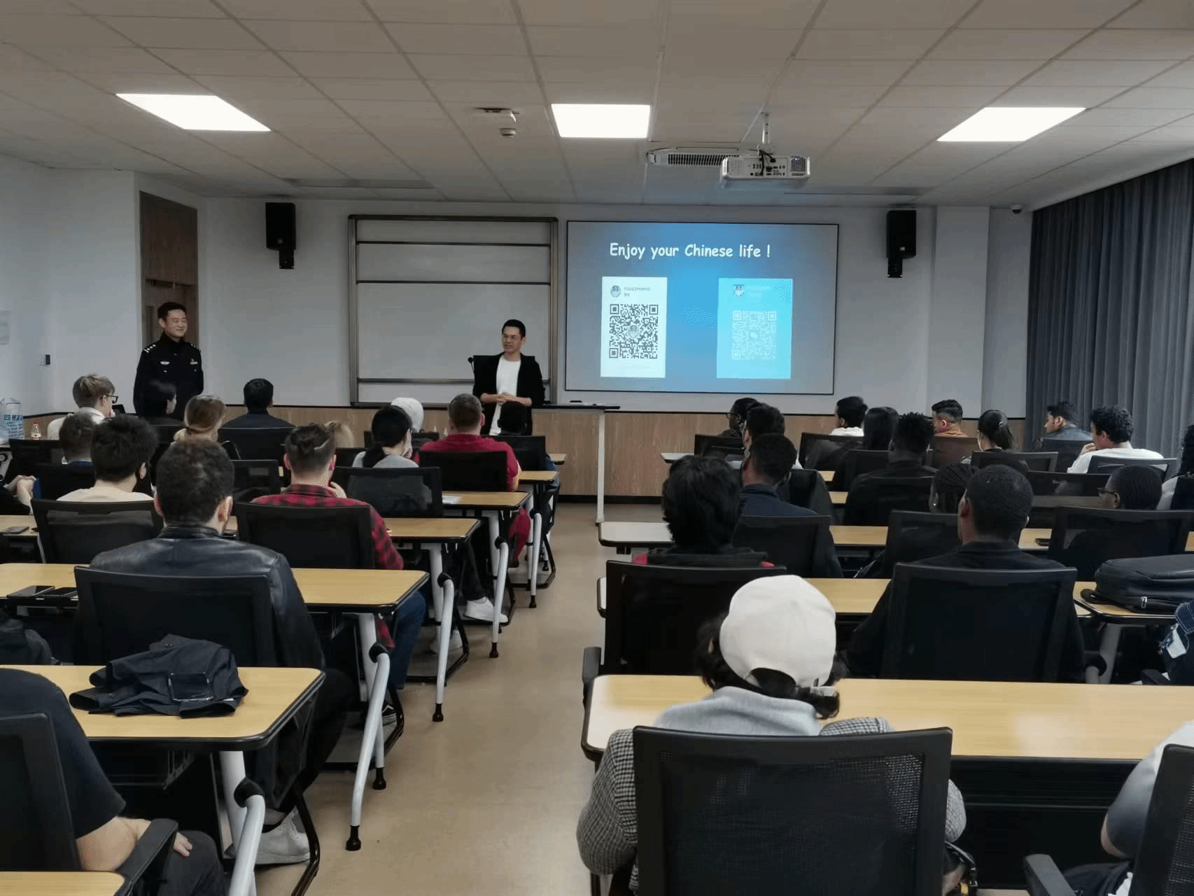 10月26日下午,第七届“夯基石、促学风”留学生主题教育活动暨新生始业讲座在曹光彪楼314教室举行。会议由毛跃祖主持。首先,宁波市庄市派出所民警杨延飞为留学生现身普及公共和校园安全知识。王警官结合社会安全事件种类、特性和危害,用大量生动丰富的案例教育警示留学生要学会保护自己,让同学们受益匪浅。此后,教务办的马士霖老师向留学生关心的教学相关问题做了科普与解读,内容设计培养方案、选课、考试安排、汉语水平考试等内容,并随后就相关问题接受了学生的提问。