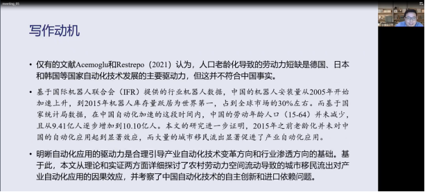 杨志才副教授给大家分享了自己的最新研究,指出城市移民流出显著提升了中国产业自动化应用,在全部城市都有作用但作用具有异质性。城市移民流出激发了中国自动化技术的本土创新,且产品逐步走向世界市场。在样本期内中国产业自动化技术进口更多,具有明显的技术缺口,需要通过进口来填补。在机制方面,城市移民流出使得城市劳动力的短缺和劳动力学历结构的改变,进而提高了工资水平,且工资波动在不同技能岗位间可传导,倒逼城市产业自动化被动应用。