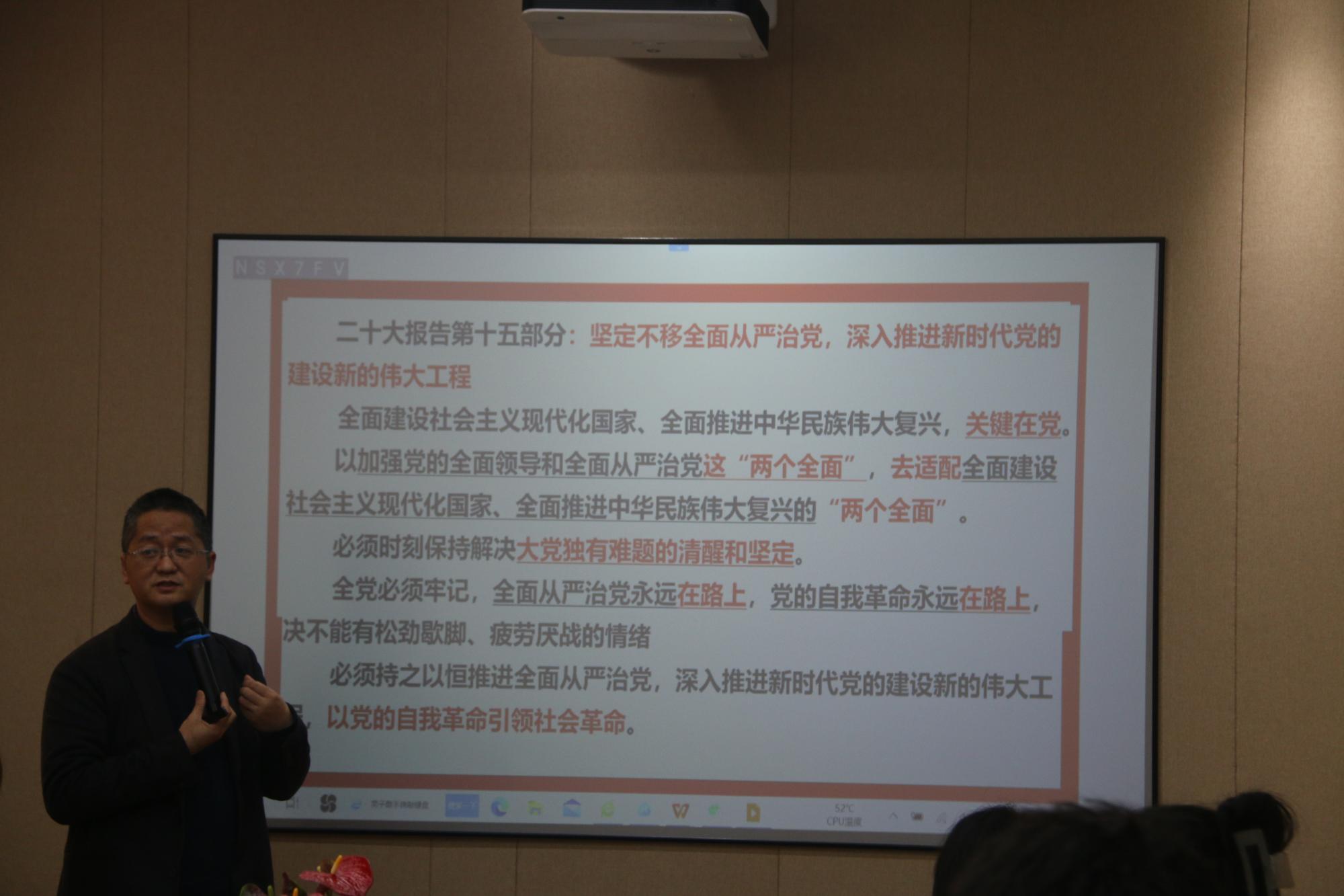 纪委委员朱福建上清廉专题党课。朱福建老师从全面从严治党的角度切入,以中国共产党的建立、形成、发展为起始点,往外拓展到政治、经济、制度权力等方面的清廉事例。他结合我国各个地区的建设、改革案例以及社会主义现代化国家建设采用的措施,用一个严密完整的思想体系和框架,将清正廉洁这个主题从国家社会层面自然过渡到个人层面,他说加强廉洁建设,需要把廉洁文化融入人民群众的日常生活之中,推动党组织将廉洁建设与改革一同开展,真正做到廉洁理念广泛、有效覆盖,走近我们,贴近生活。
