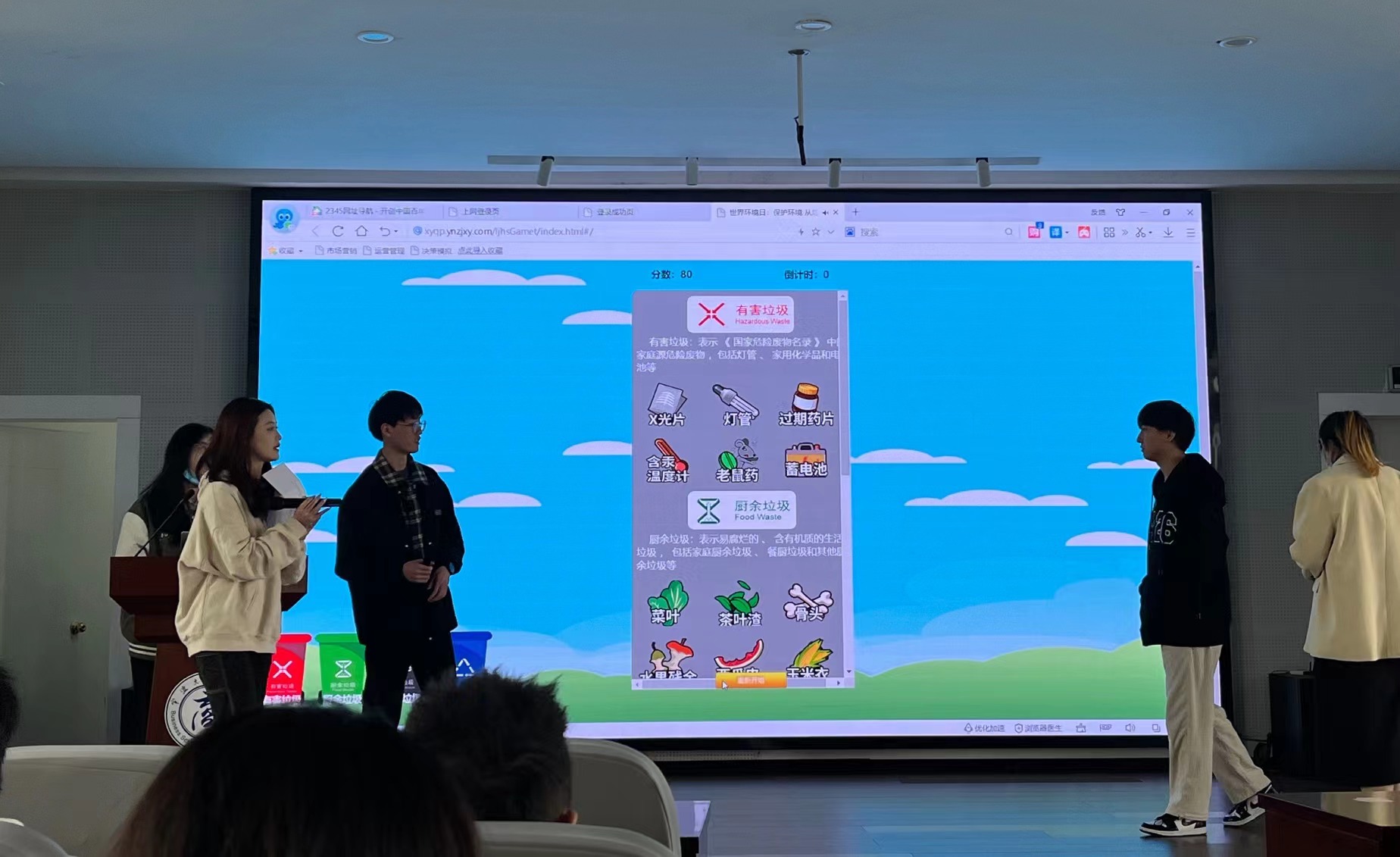 最后,开展了垃圾分类知识竞赛,本次比赛采取积分制,现场邀请同学们参加。当屏幕上出现垃圾回收物时,选择对应的分类垃圾桶进行投放,在规定时间内达到一定的积分便可以获得奖品。此次垃圾分类知识竞赛活动以寓教于乐的形式让垃圾分类意识深入人心,促使同学们进一步认识到垃圾分类工作的重要性以及掌握部分垃圾分类的方法,提升垃圾分类意识。