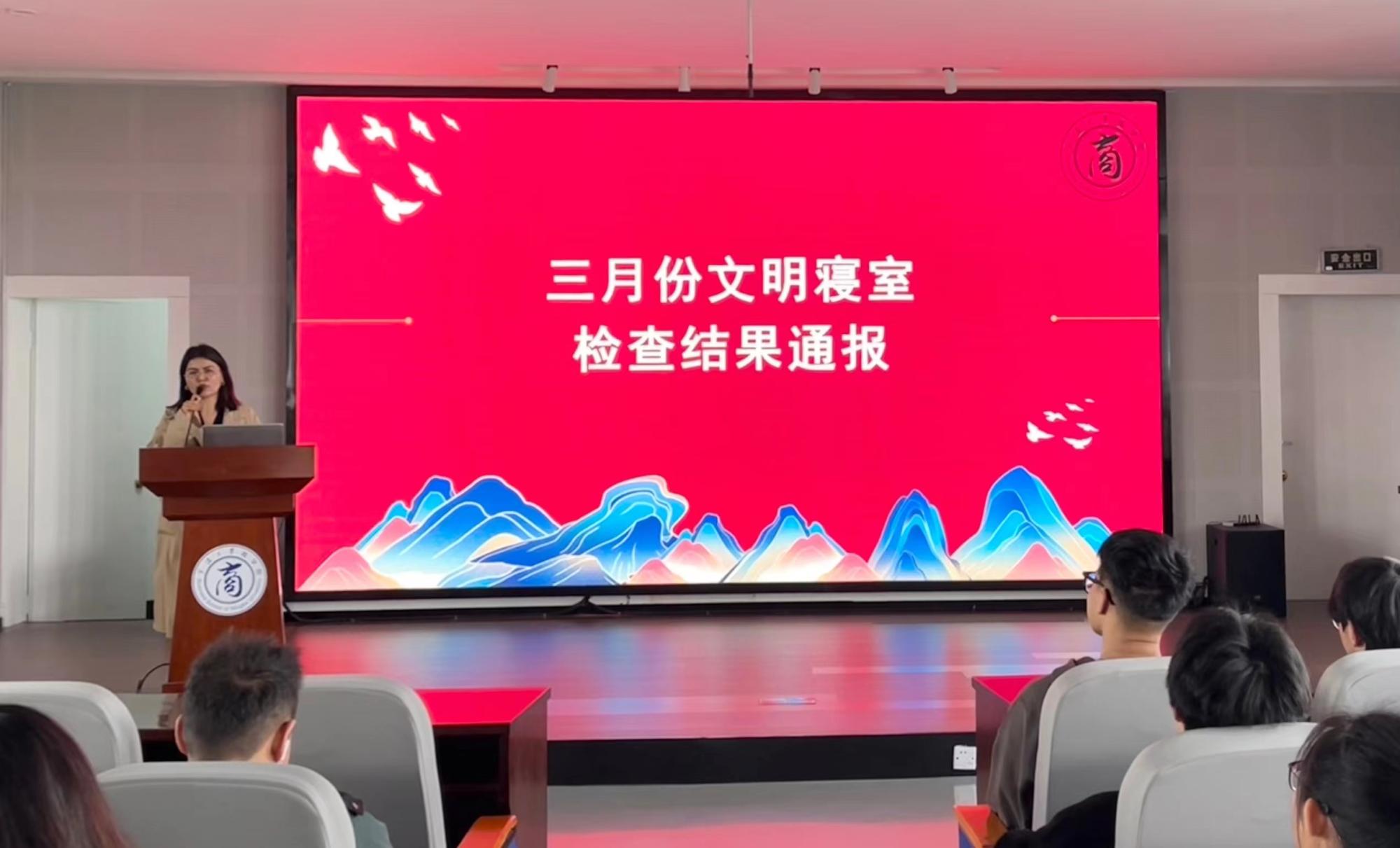 3月份文明寝室检查结果,并对优秀寝室学生的自觉自律和文明就寝行为给予了充分肯定,她鼓励优秀寝室代表以榜样引领更多的同学一起营造文明舒适的寝室环境,她呼吁同学们一定要注意寝室安全,严禁使用违规电器,共同维护安全和谐的寝室环境。