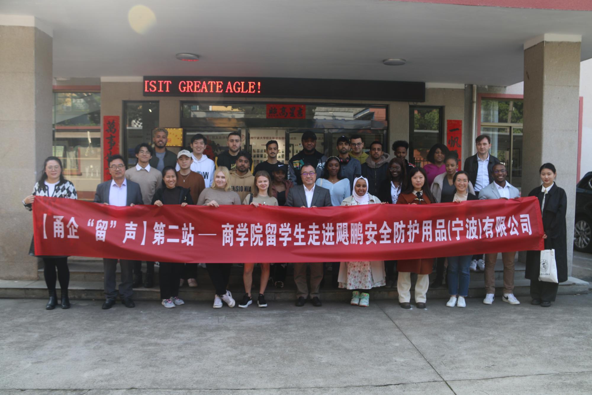 校友会联合鄞州校友会推出甬企“留”声活动再次启航,活动的第二站走进了飓鹏安全防护用品(宁波)有限公司,也是鄞州区宁波大学校友会的根据地,共有23名留学生参与其中,受到飓鹏安全防护用品(宁波)有限公司董事长董建伟、鄞州宁波大学联谊会副会长庄学东等人的热情接待。