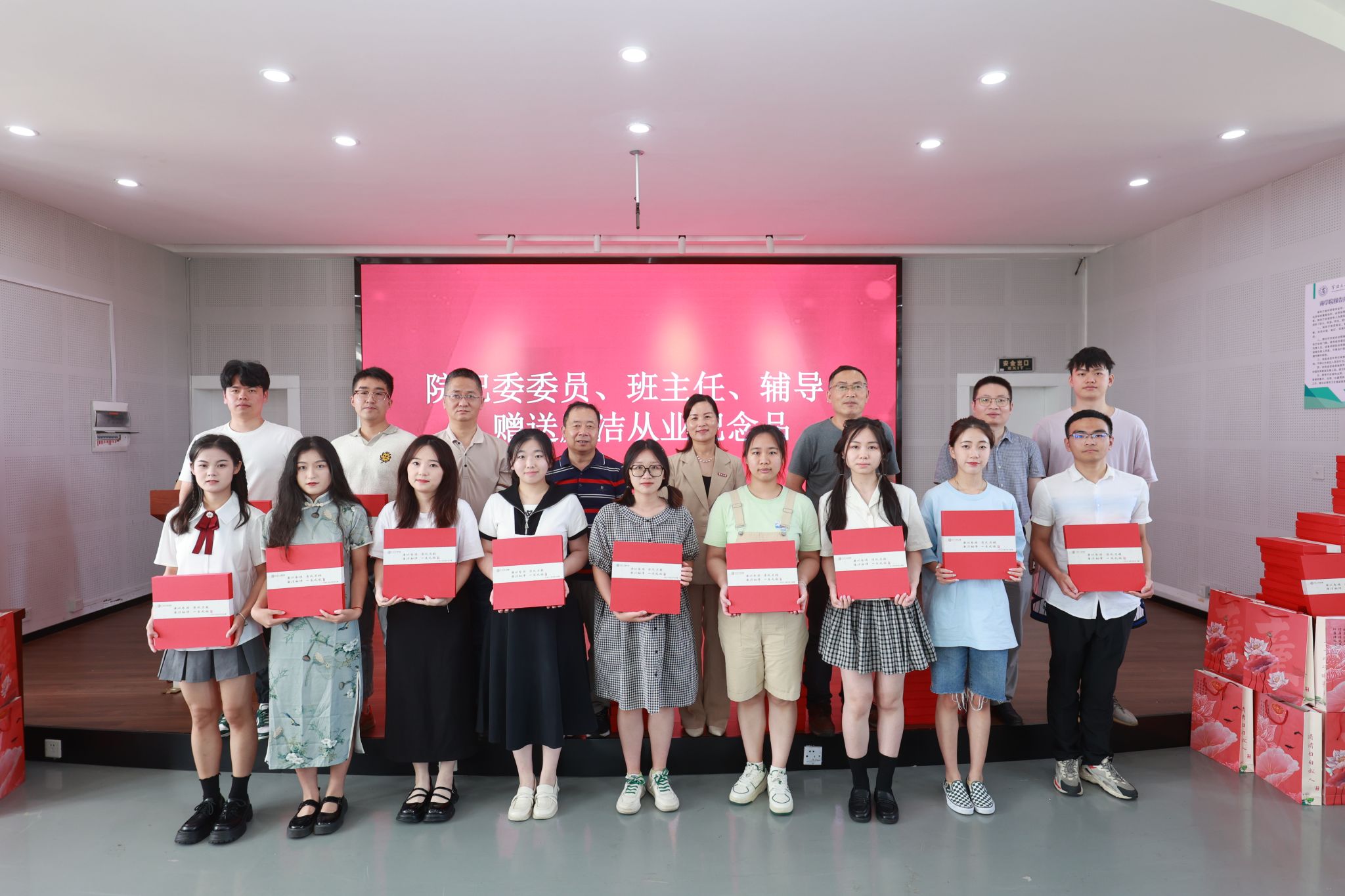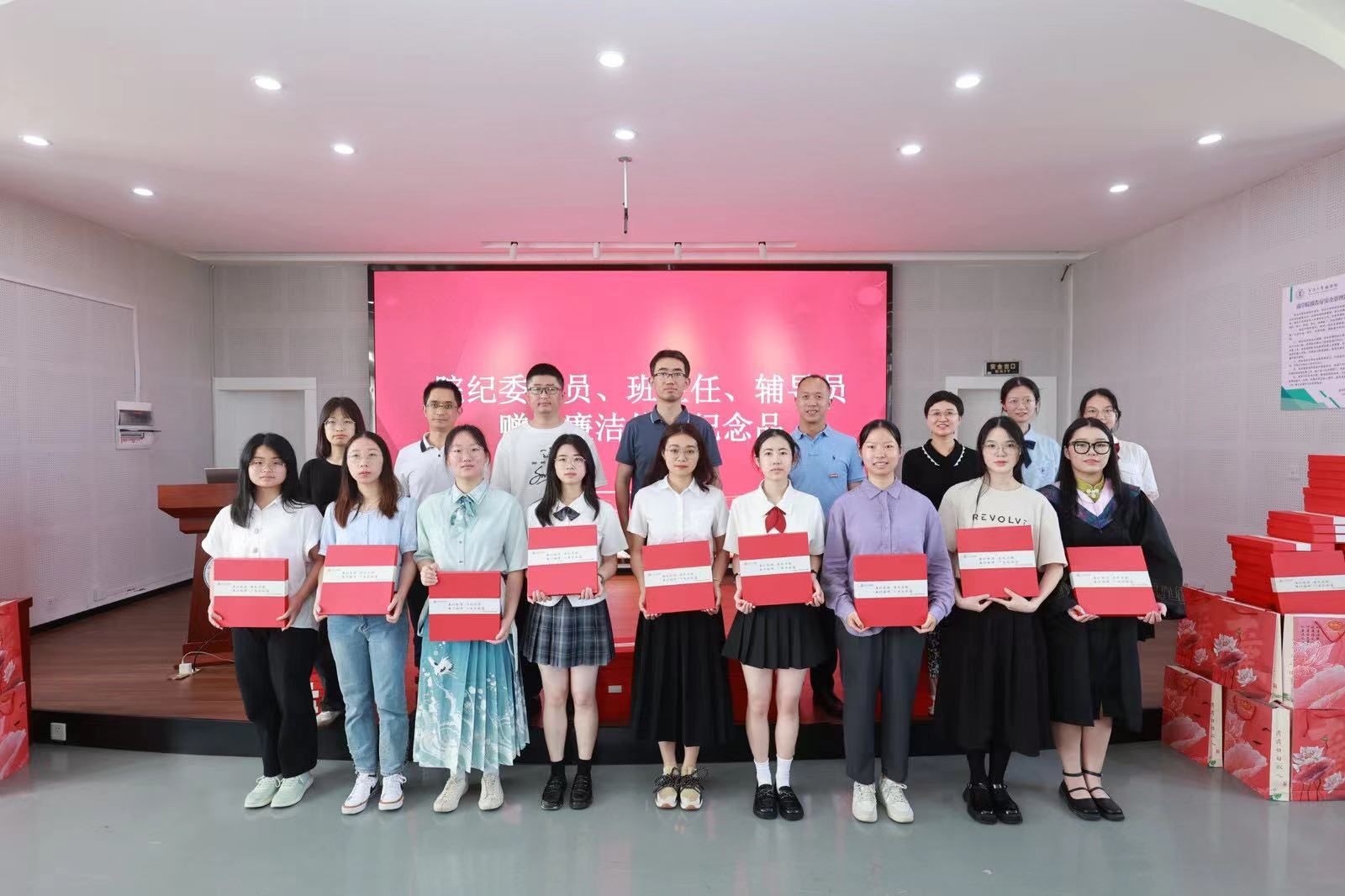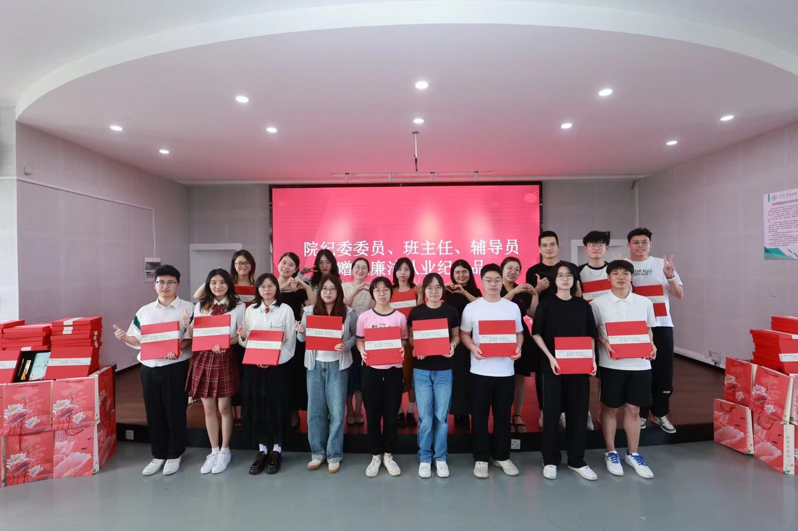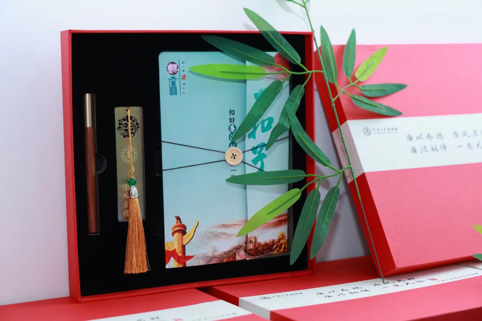 为毕业生党员送上了一份精心准备的纪念品套盒,其中包含一本扣上廉洁从业扣子的书套,里面印有习近平总书记对青年的廉洁语录,指引毕业生们沿着正确的方向追求梦想;一枚戒尺,心中有尺,行事有度,尺上刻有“廉洁相伴,一生无憾”;一支檀木笔,叮嘱大家下笔清晰有力,堂堂正正做事,书写自己的灿烂人生。这一套盒由菠菜网站