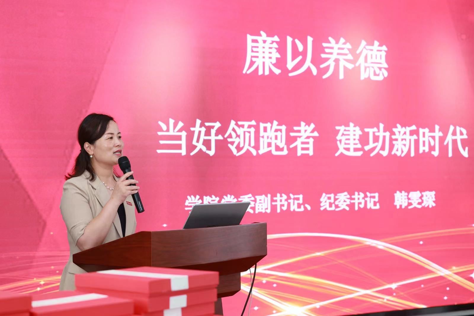 党委副书记、纪委书记韩雯琛为毕业生上题为“廉以养德,当好领跑者,建功新时代”的廉洁教育党课。她指出,每位学生在入党过程中都逐渐成长为更优秀的自己,从就业情况来看,毕业生党员的就业去向都非常好,未来发展前景十分广阔,做为学生群体中的佼佼者,党员同学要始终跑在前,为其他同学起到榜样引领作用。韩雯琛代表菠菜网站