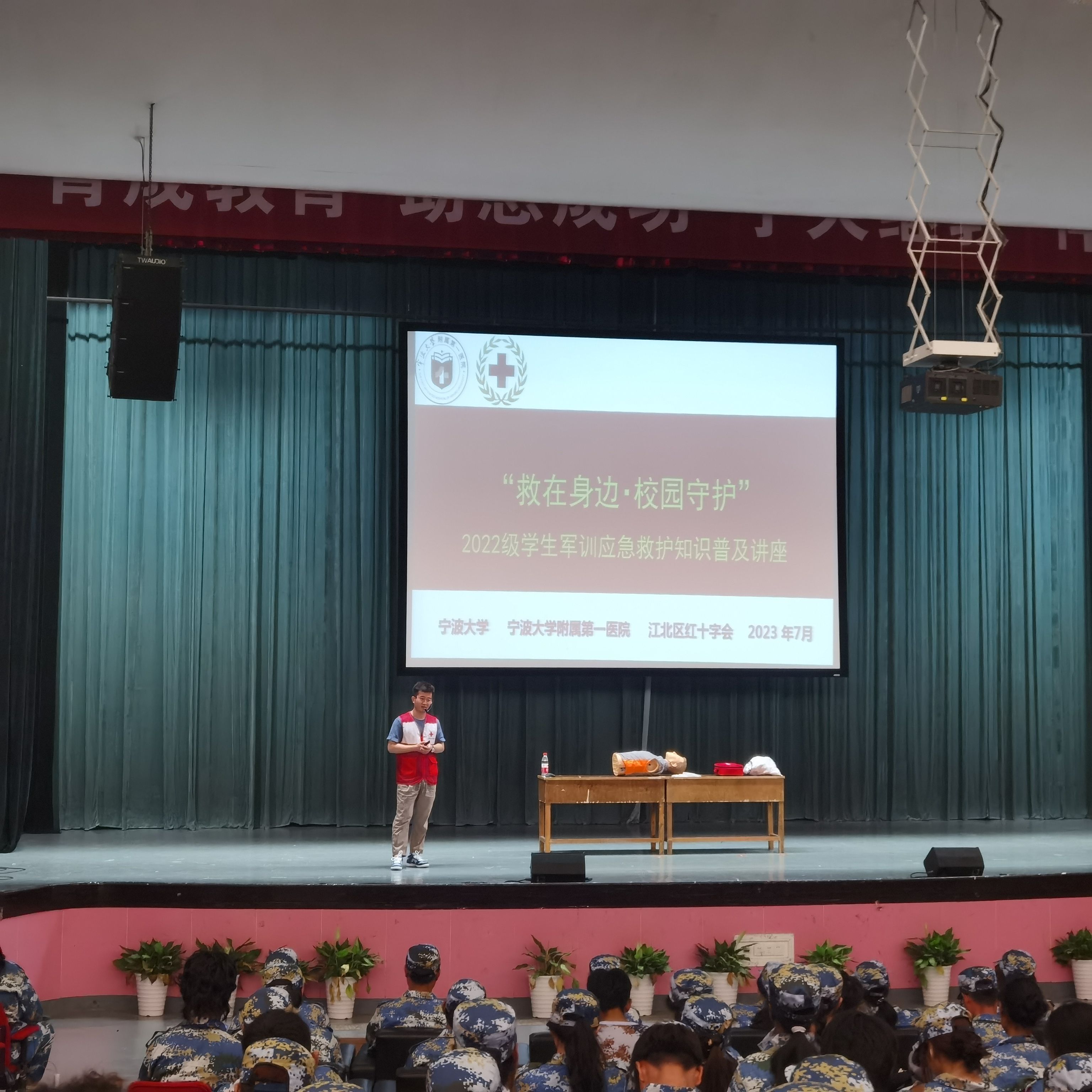 在林杏琴会堂举行2022级学生军训应急救护知识普及教育讲座。宁波大学附属第一医院医师、江北区红十字会会员陈阳受邀为十大菠菜网站